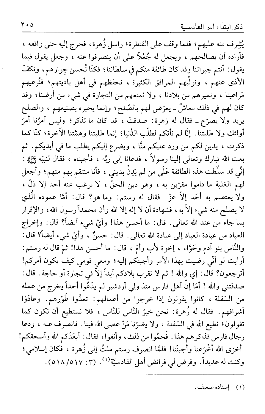 يُشِرف منه عليهم؛ فلما وقف على القنطرة؛ راسل زُهرة، فخرج إليه حتى واقفه، فأراده أن يصالحهم، ويجعل له جُعْلًا على أن ينصرفوا عنه، وجعل يقول فيما يقول: أنتم جيراننا وقد كان طائفة منكم في سلطاننا؛ فكنّا نُحسن جِوارهم، ونكفّ الأذى عنهم، ونولِّيهم المرافق الكثيرة، نحفظهم في أهل باديتهم؛ فنُرعيهم مَراعينا، ونميرهم من بلادنا، ولا نمنعهم من التجارة في شيء من أرضنا؛ وقد كان لهم في ذلك معاشٌ - يعرّض لهم بالصّلح؛ وإنما يخبره بصنيعهم، والصلح يريد ولا يصرّح - فقال له زهرة: صدقتَ، قد كان ما تذكر؛ وليس أمرُنا أمرَ أولئك ولا طلبتنا. إنَّا لم نأتكم لطلَب الدُّنيا؛ إنما طلبتنا وهمَّتنا الآخرة؛ كنّا كما ذكرت، يدين لكم من ورد عليكم منَّا، ويضرع إليكم يطلب ما في أيديكم. ثم بعث الله تبارك وتعالى إلينا رسولًا، فدعانا إلى ربِّه، فأجبناه، فقال لنبيّه - صلى الله عليه وسلم -: إنِّي قد سلَّطت هذه الطائفة عَلَى من لم يَدِن بديني، فأنا منتقم بهم منهم؛ وأجعل لهم الغلبة ما داموا مقرّين به، وهو دين الحقّ، لا يرغب عنه أحد إلا ذلّ، ولا يعتصم به أحَد إلّا عزّ. فقال له رستم: وما هو؟ قال: أمَّا عموده الَّذي لا يصلح منه شيء إلّا به، فشهادة أن لا إله إلا الله وأن محمدًا رسول الله، والإقرار بما جاء من عند الله تعالى. قال: ما أحسن هذا! وأيّ شيء أيضًا؟ قال: وإخراج العباد من عبادة العباد إلى عبادة الله تعالى. قال: حسن، وأيّ شيء أيضًا؟ قال: والنَّاس بنو آدم وحَوَّاء، إخوة لأب وأمّ، قال: ما أحسن هذا! ثمّ قال له رستم: أرأيت لو أني رضيت بهذا الأمر وأجبتكم إليه؛ ومعي قومي كيف يكون أمركم! أترجعون؟ قال: إي والله! ثم لا نقرب بلادكم أبدًا إلّا في تجارة أو حاجة. قال: صدقتني والله! أمَا إنّ أهل فارس منذ ولي أردشير لم يدَعُوا أحدًا يخرج من عمله من السّفلة، كانوا يقولون إذا خرجوا من أعمالهم: تعدَّوا طَوْرهم. وعادَوْا أشرافهم. فقال له زُهرة: نحن خيرُ النَّاس للنَّاس، فلا نستطيع أن نكون كما تقولون؛ نطيع الله في السّفلة، ولا يضرّنا مَنْ عصى الله فينا. فانصرف عنه، ودعا رجال فارس فذاكرهم هذا. فَحمُوا من ذلك، وأنفوا، فقال: أبعَدَكم الله وأسحقكم! أخزى الله أخْرَعنا وأجبنَنا! فلمَّا انصرف رستم ملتُ إلى زُهرة، فكان إسلامي؛ وكنت له عديدًا. وفرض لي فرائض أهل القادسيَّة (١). (٣: ٥١٧/ ٥١٨).
