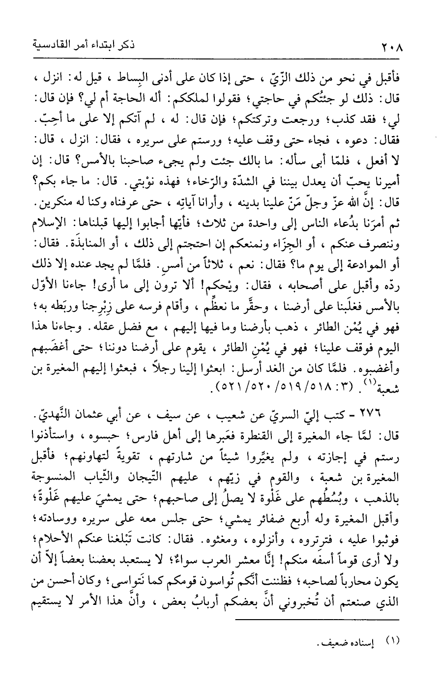 ٢٧٦ - كتب إليّ السريّ عن شعيب، عن سيف، عن أبي عثمان النَّهديّ. قال: لمَّا جاء المغيرة إلى القنطرة فعَبرها إلى أهل فارس؛ حبسوه، واستأذنوا رستم في إجازته، ولم يغيِّروا شيئًا من شارتهم، تقويةً لتهاونهم؛ فأقبل المغيرة بن شعبة، والقوم في زيّهم، عليهم التّيجان والثّياب المنسوجة بالذهب، وبُسُطُهم على غَلْوة لا يصلُ إلى صاحبهم؛ حتى يمشيَ عليهم غَلْوةً؛ وأقبل المغيرة وله أربع ضفائر يمشي؛ حتى جلس معه على سريره ووسادته؛ فوثبوا عليه، فترِتروه، وأنزلوه، ومغثوه. فقال: كانت تَبْلغنا عنكم الأحلام؛ ولا أرى قومًا أسفه منكم! إنَّا معشر العرب سواءٌ؛ لا يستعبد بعضنا بعضًا إلّا أن يكون محاربًا لصاحبه؛ فظننت أنَّكم تُواسون قومكم كما نَتواسى؛ وكان أحسن من الذي صنعتم أن تُخبروني أنَّ بعضكم أربابُ بعض، وأنَّ هذا الأمر لا يستقيم