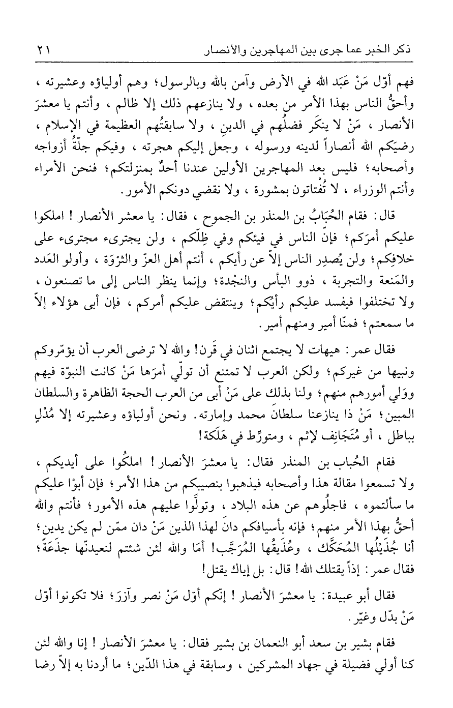 قال: فقام الحُبَابُ بن المنذر بن الجموح، فقال: يا معشر الأنصار! املكوا عليكم أمرَكم؛ فإنّ الناس في فيئكم وفي ظِلّكم، ولن يجترئ مجترئ على خلافِكم؛ ولن يُصدِر الناس إلّا عن رأيكم، أنتم أهل العزّ والثرْوَة، وأولو العَدد والمَنعة والتجربة، ذوو البأس والنجْدة؛ وإنما ينظر الناس إلى ما تصنعون، ولا تختلفوا فيفسد عليكم رأيُكم؛ وينتقض عليكم أمركم، فإن أبي هؤلاء إلّا ما سمعتم؛ فمنّا أمير ومنهم أمير.