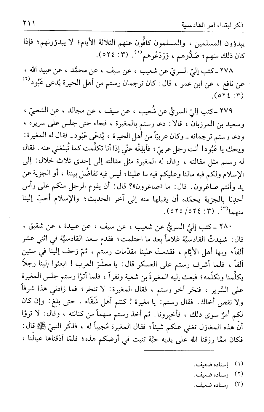 ٢٧٩ - كتب إليّ السريُّ عن شُعيب، عن سيف، عن مجالد، عن الشعبيّ، وسعيد بن المرزبان، قالا: دعا رستم بالمغيرة، فجاء حتى جلس على سريره، ودعا رستم ترجمانه -وكان عربيًّا من أهل الحيرة، يُدعَى عَبُود- فقال له المغيرة: ويحك يا عَبُود! أنت رجل عربيّ؛ فأبلِغْه عنّي إذا أنا تكلَّمت كما تُبلغني عنه. فقال له رستم مثل مقالته، وقال له المغيرة مثل مقالته إلى إحدى ثلاث خلال: إلى الإسلام ولكم فيه مالنا وعليكم فيه ما علينا؛ ليس فيه تفاضُل بيننا، أو الجزية عن يد وأنتم صاغرون. قال: ما "صاغرون"؟ قال: أن يقوم الرجل منكم على رأس أحدِنا بالجزية يحمَده أن يقبلها منه إلى آخر الحديث؛ والإسلام أحبّ إلينا منهما (٣). (٣: ٥٢٤/ ٥٢٥).