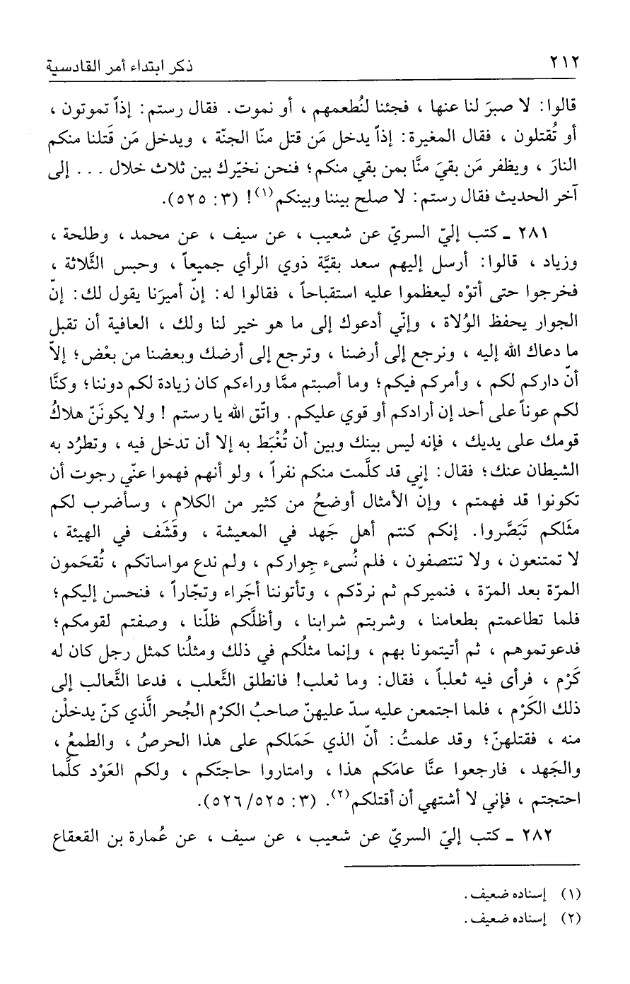 ٢٨١ - كتب إليّ السريّ عن شعيب، عن سيف، عن محمد، وطلحة، وزياد، قالوا: أرسل إليهم سعد بقيَّة ذوي الرأي جميعًا، وحبس الثَّلاثة، فخرجوا حتى أتوْه ليعظموا عليه استقباحًا، فقالوا له: إنّ أميرَنا يقول لك: إنّ الجوار يحفظ الوُلاة، وإنّي أدعوك إلى ما هو خير لنا ولك، العافية أن تقبل ما دعاك الله إليه، ونرجع إلى أرضنا، وترجع إلى أرضك وبعضنا من بعْض؛ إلّا أن داركم لكم، وأمركم فيكم؛ وما أصبتم ممَّا وراءكم كان زيادة لكم دوننا؛ وكنَّا لكم عونًا على أحد إن أرادكم أو قوي عليكم. واتّق الله يا رستم! ولا يكونَنّ هلاكُ قومك على يديك، فإنه ليس بينك وبين أن تُغْبَط به إلا أن تدخل فيه، وتطرُد به الشيطان عنك؛ فقال: إني قد كلَّمت منكم نفرًا، ولو أنهم فهموا عنّي رجوت أن تكونوا قد فهمتم، وإنّ الأمثال أوضحُ من كثير من الكلامِ، وسأضرب لكم مثَلكم تَبَصَّروا. إنكم كنتم أهل جَهد في المعيشة، وقشَف في الهيئة، لا تمتنعون، ولا تنتصفون، فلم نُسئ جِواركم، ولم ندع مواساتكم، تُقحَمون المرّة بعد المرّة، فنميركم ثم نردّكم، وتأتوننا أجَراء وتجّارًا، فنحسن إليكم؛ فلما تطاعمتم بطعامنا، وشربتم شرابنا، وأظلَّكم ظلّنا، وصفتم لقومكم؛ فدعوتموهم، ثم أتيتمونا بهم، وإنما مثلُكم في ذلك ومثلُنا كمثل رجل كان له كَرْم، فرأى فيه ثعلبًا، فقال: وما ثعلب! فانطلق الثَّعلب، فدعا الثَّعالب إلى ذلك الكَرْم، فلما اجتمعن عليه سدّ عليهنّ صاحبُ الكرْم الجُحر الَّذي كنّ يدخلْن منه، فقتلهنّ؛ وقد علمتُ: أنّ الذي حَمَلكم على هذا الحرصُ، والطمعُ، والجَهد، فارجعوا عنَّا عامَكم هذا، وامتاروا حاجتَكم، ولكم العَوْد كلَّما احتجتم، فإني لا أشتهي أن أقتلكم (٢). (٣: ٥٢٥/ ٥٢٦).