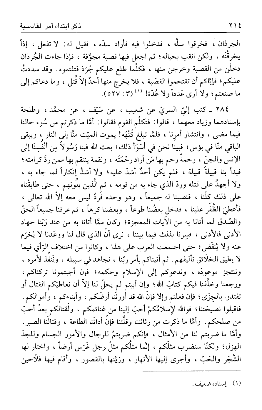 ٢٨٤ - كتب إليّ السريّ عن شعيب، عن سَيْف، عن محمَّد، وطلحة بإسنادهما وزياد معهما، قالوا: فتكلَّم القوم فقالوا: أمَّا ما ذكرتم من سُوء حالنا فيما مضى، وانتشار أمرِنا، فلمَّا تبلغ كُنْهَه! يموت الميّت منَّا إلى النار، ويبقى الباقي منا في بؤس؛ فبينا نحن في أسْوَأ ذلك؛ بعث الله فينا رَسُولًا مِن أنْفُسِنَا إلى الإنس والجنّ، رحمةً رحم بها مَن أراد رحْمَتَه، ونقمة ينتقم بها ممن ردَّ كرامته؛ فبدأ بنا قبيلة قبيلة، فلم يكن أحدٌ أشدّ عليه؛ ولا أشدُّ إنكارًا لما جاء به، ولا أجهدُ على قتله وردّ الذي جاء به من قومه، ثمِ الَّذين يلُولْهم، حتى طابقْناه على ذلك كلّنا، فنصبنا له جميعًا، وهو وحده فردٌ ليس معه إلّا الله تعالى، فأعطيَ الظَّفَر علينا، فدخل بعضُنا طوعًا، وبعضنا كرهًا، ثم عرفنا جميعًا الحقّ والصّدق لما أتانا به من الآيات المعجزة؛ وكان ممَّا أتانا به من عند رَبّنا جهاد الأدنى فالأدنى، فسِرنا بذلك فيما بيننا، نرى أنّ الذي قال لنا ووعَدنا لا يُخرَم عنه ولا يُنقَض؛ حتى اجتمعت العرب على هذا، وكانوا من اختلاف الرّأي فيما لا يطيق الخلائق تأليفهم. ثم أتيناكم بأمر ربّنا، نجاهد في سبيله، ونَنفُذ لأمره، وننتجز موعودَه، وندعوكم إلى الإسلام وحكمه؛ فإن أجبتمونا تركناكم، ورجعنا وخلَّفنا فيكم كتابَ الله؛ وإن أبيتم لم يحلّ لنا إلّا أن نعاطيَكم القتال أو تفتدوا بالجِزَى؛ فإن فعلتم وإلا فإنّ الله قد أورثَنا أرضَكم، وأبناءكم، وأموالكم. فاقبلوا نصيحَتنا؛ فوالله لإِسلامُكمْ أحبّ إلينا من غنائمكم، ولَقتالكم بعدُ أحبّ من صلحكم. وأمَّا ما ذكرت من رثاثتنا وقلَّتنا فإنّ أداتَنا الطاعة، وقتالَنا الصبر. وأمَّا ما ضربتم لنا من الأمثال، فإنكم ضربتمُ للرجال والأمور الجسام وللجدّ الهزل؛ ولكنّا سنضرب مثلَكم، إنَّما مثلُكم مثلُ رجل غَرَس أرضًا، واختار لها الشَّجَر والحَبّ، وأجرى إليها الأنهار، وزيَّنها بالقصور، وأقام فيها فلّاحين
