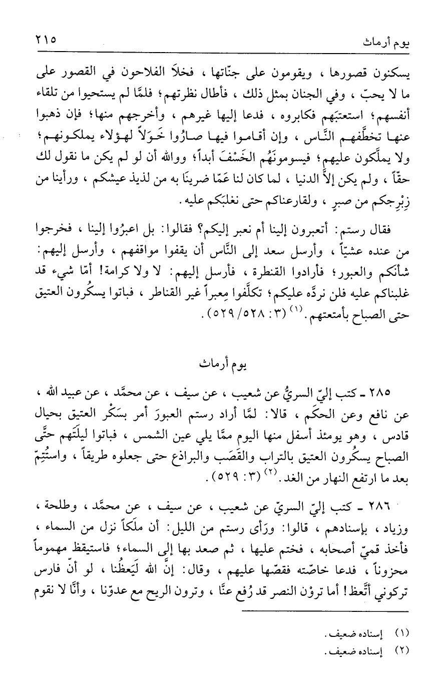 ٢٨٥ - كتب إليّ السريُّ عن شعيب، عن سيف، عن محمَّد، عن عبيد الله، عن نافع وعن الحكَم، قالا: لمَّا أراد رستم العبورَ أمر بسَكْر العتيق بحيال قادس، وهو يومئذ أسفل منها اليوم ممَّا يلي عين الشمس، فباتوا ليلَتَهم حتَّى الصباح يسكُرون العتيق بالتراب والقَصَب والبراذع حتى جعلوه طريقًا، واستُتِمّ بعد ما ارتفع النهار من الغد. (٢) (٣: ٥٢٩).