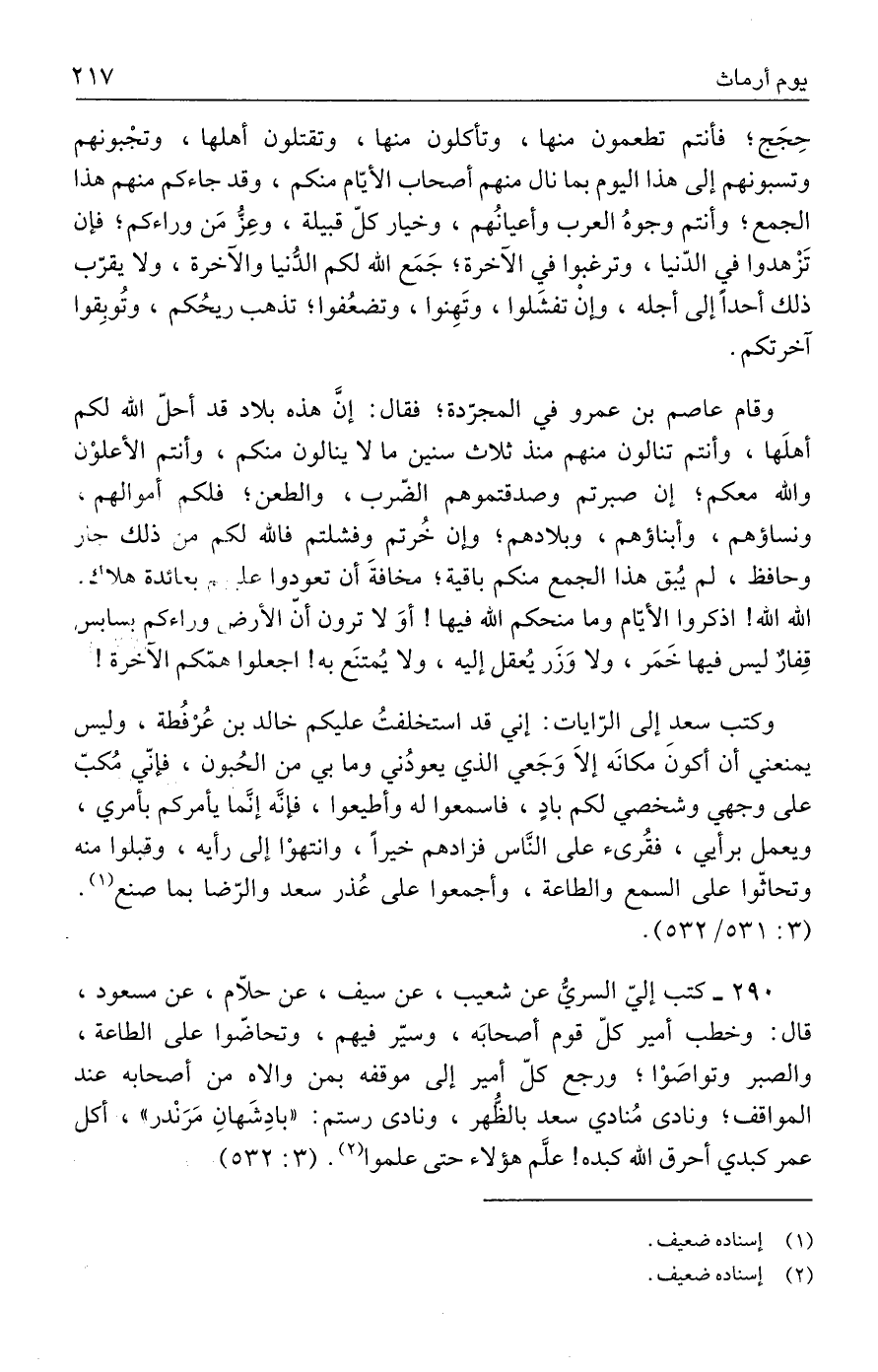 ٢٩٠ - كتب إليّ السريُّ عن شعيب، عن سيف، عن حلّام، عن مسعود، قال: وخطب أمير كلّ قوم أصحابَه، وسيّر فيهم، وتحاضّوا على الطاعة، والصبر وتواصَوْا؛ ورجع كلّ أمير إلى موقفه بمن والاه من أصحابه عند المواقف؛ ونادى مُنادي سعد بالظُّهر، ونادى رستم: "بادِشَهانِ مَرَنْدر"، أكل عمر كبدي أحرق الله كبده! علَّم هؤلاء حتى علموا (٢). (٣: ٥٣٢)