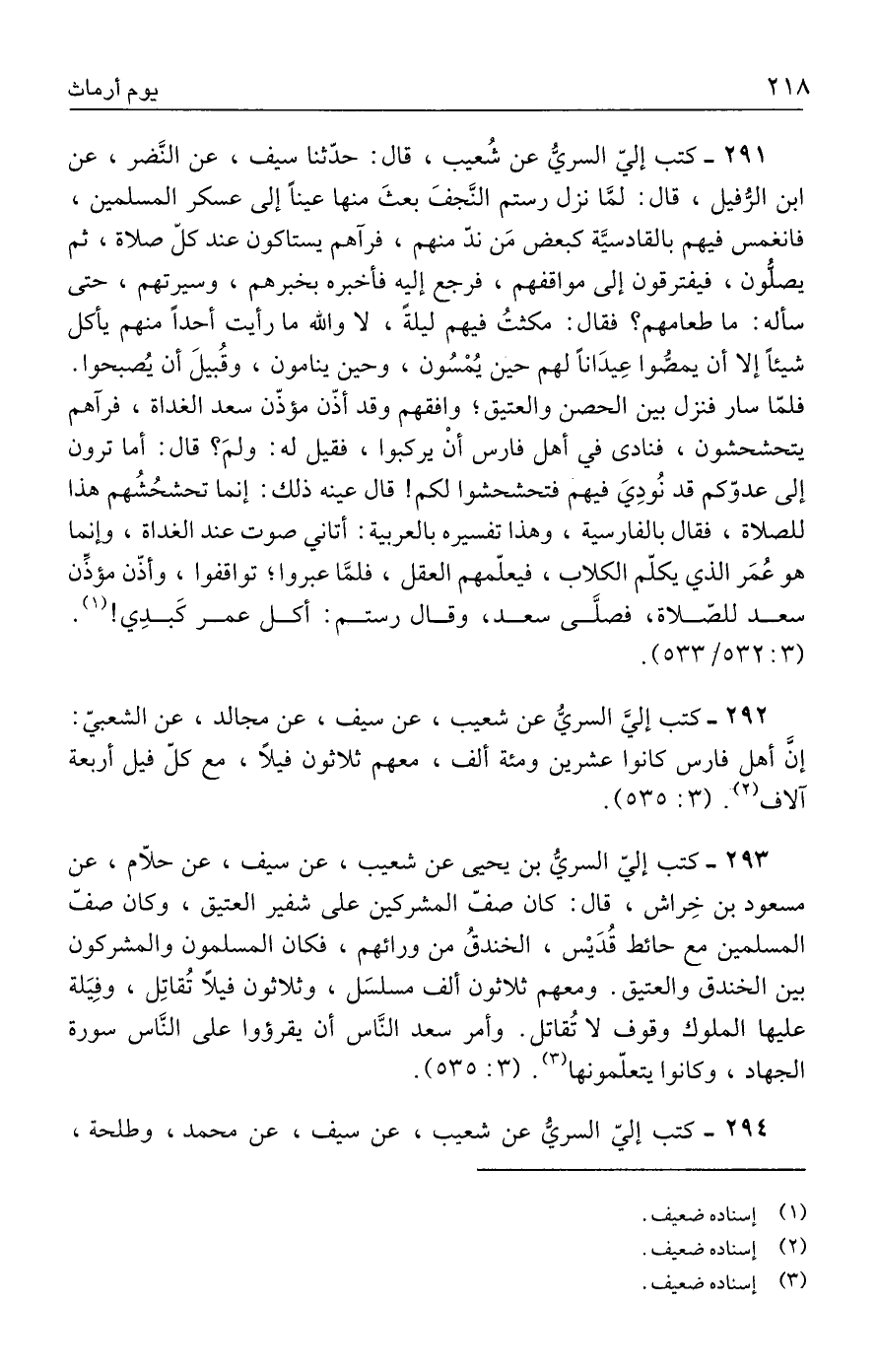 ٢٩٢ - كتب إليَّ السريُّ عن شعيب، عن سيف، عن مجالد، عن الشعبيّ: إنَ أهل فارس كانوا عشرين ومئة ألف، معهم ثلاثون فيلًا، مع كلّ فيل أربعة آلاف (٢). (٣: ٥٣٥).