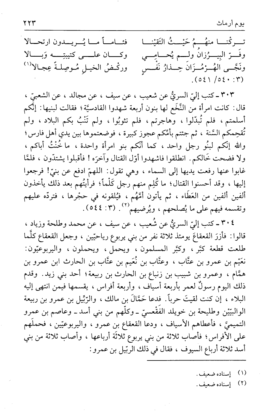 ٣٠٤ - كتب إليّ السريُّ عن شُعيب، عن سيف، عن محمد وطلحة وزياد، قالوا: فأزرَ القعقاعَ يومئذ ثلاثة نفر من بني يربوع رياحيّين، وجعل القعقاع كلَّما طلعت قطعة كبَّر، وكبَّر المسلمون، ويحمل، ويحملون، واليربوعيّون: نعَيْم بن عمرو بن عتَّاب، وعتَّاب بن نُعَيم بن عتَّاب بن الحارث بن عمرو بن همَّام، وعمرو بن شبيب بن زنباع بن الحارث بن ربيعة؛ أحد بني زيد. وقدم ذلك اليوم رسولٌ لعمر بأربعة أسياف، وأربعة أفراس، يقسمها فيمن انتهى إليه البلاء، إن كنت لقيتَ حربًا. فدعا حَمَّالَ بن مالك، والرّبِّيل بن عمرو بن ربيعة الوالبيّيْن وطليحة بن خويلد الفَقْعسيّ - وكلّهم من بني أسد - وعاصم بن عمرو التميميَّ، فأعطاهم الأسياف، ودعا القعقاع بن عمرو، واليربوعيّين، فحملَهم على الأفراس؛ فأصاب ثلاثة من بني يربوع ثلاثَة أرباعها، وأصاب ثلاثة من بني أسد ثلاثة أرباع السيوف، فقال في ذلك الربّيل بن عمرو: