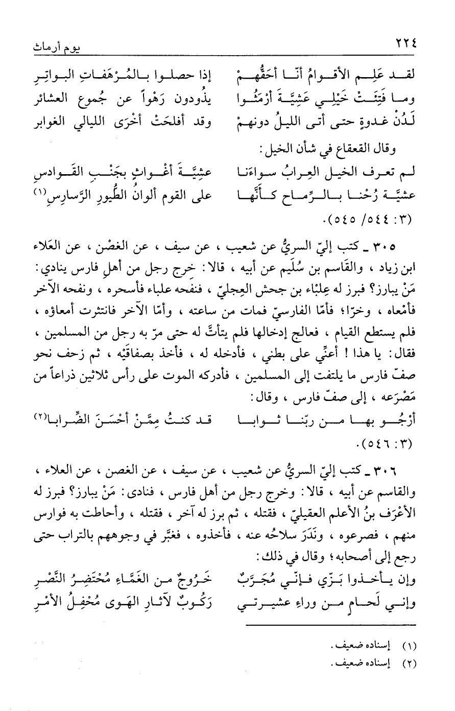 ٣٠٦ - كتب إليّ السريُّ عن شعيب، عن سيف، عن الغصن، عن العلاء، والقاسم عن أبيه، قالا: وخرج رجل من أهل فارس، فنادى: مَنْ يبارز؟ فبرز له الأعْرَف بنُ الأعلم العقيليّ، فقتله، ثم برز له آخر، فقتله، وأحاطت به فوارس منهم، فصرعوه، ونَدَرَ سلاحُه عنه، فأخذوه، فغبَّر في وجوههم بالتراب حتى رجع إلى أصحابه؛ وقال في ذلك: