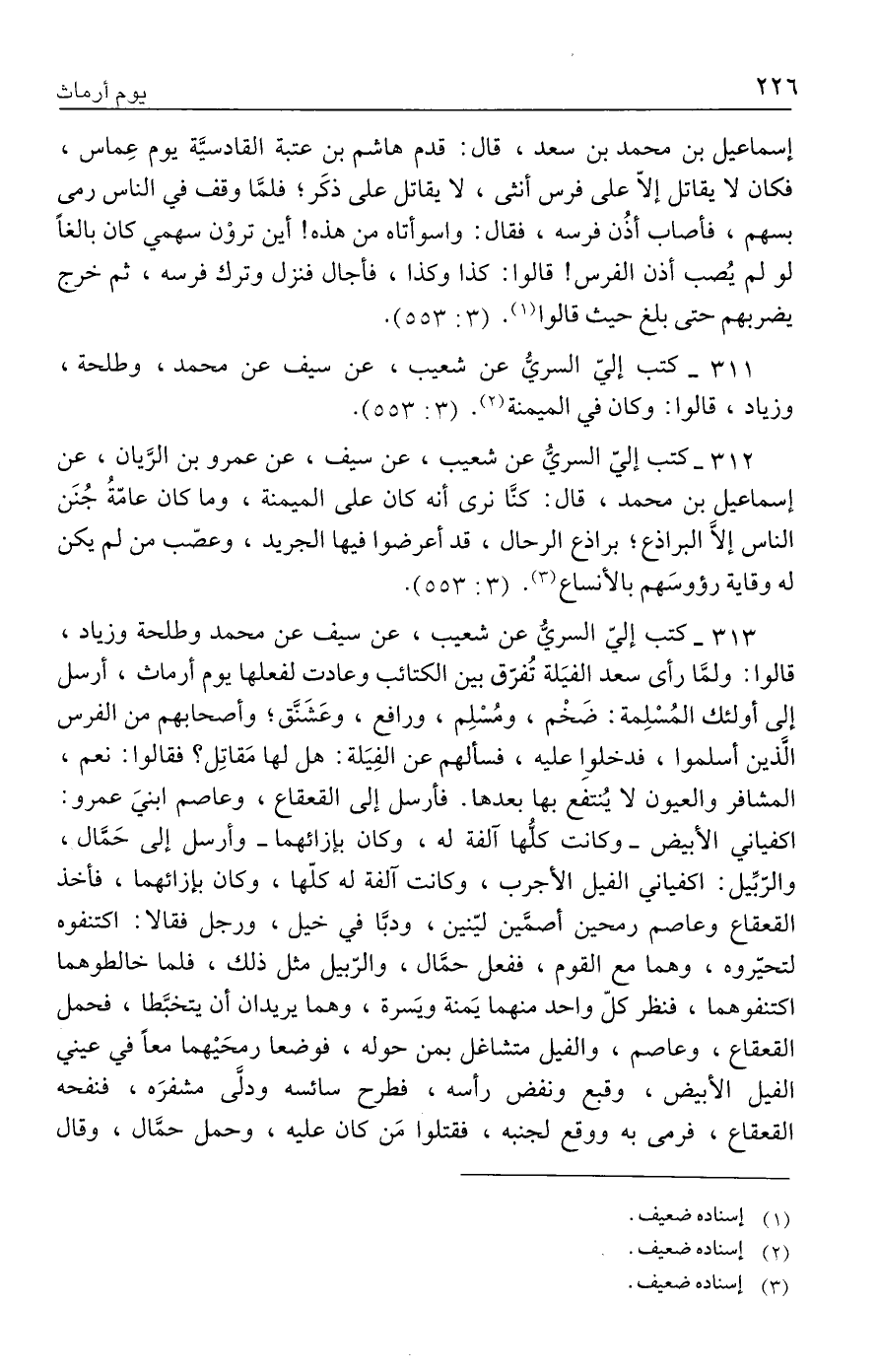 ٣١١ - كتب إليّ السريُّ عن شعيب، عن سيف عن محمد، وطلحة، وزياد، قالوا: وكان في الميمنة (٢). (٣: ٥٥٣).
