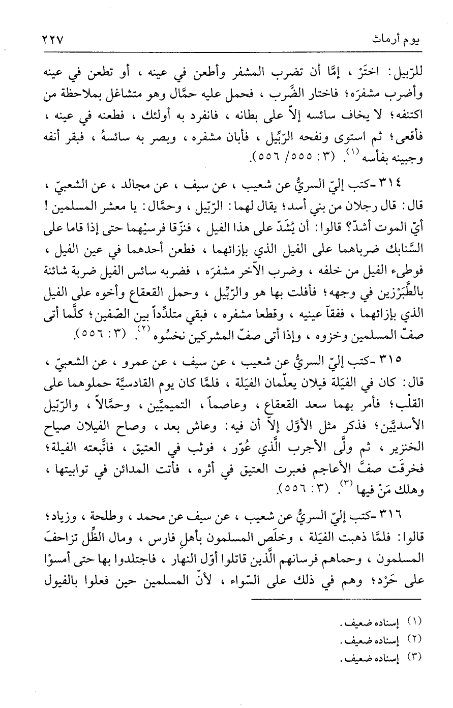 ٣١٥ - كتب إليّ السريُّ عن شعيب، عن سيف، عن عمرو، عن الشعبيّ، قال: كان فى الفيَلة فيلان يعلّمان الفيَلة، فلمَّا كان يوم القادسيَّة حملوهما على القلْب؛ فأمّر بهما سعد القعقاع، وعاصمًا، التميميَّين، وحمَّالًا، والرّبّيل الأسديَّين؛ فذكر مثل الأوَّل إلّا أن فيه: وعاش بعد، وصاح الفيلان صياح الخنزير، ثم ولَّى الأجرب الَّذي عُوّر، فوثب في العتيق، فاتَّبعته الفيلة؛ فخرقَت صفَّ الأعاجم فعبرت العتيق في أثره، فأتت المدائن في توابيتها، وهلك مَنْ فيها (٣). (٣: ٥٥٦).