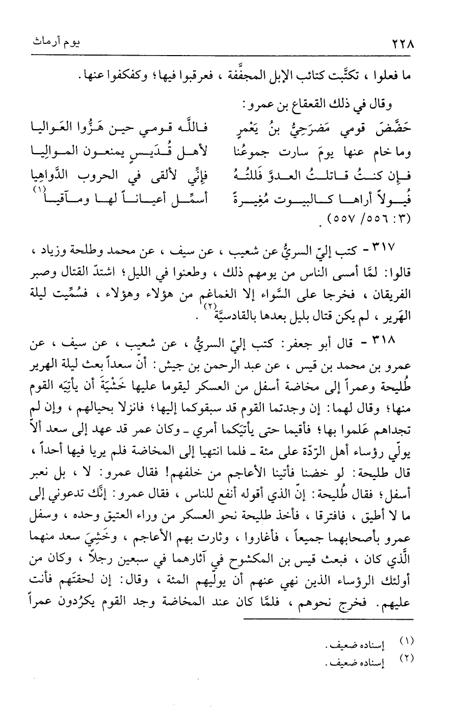 ٣١٨ - قال أبو جعفر: كتب إليّ السريُّ، عن شعيب، عن سيف، عن عمرو بن محمد بن قيس، عن عبد الرحمن بن جيش: أنّ سعدًا بعث ليلة الهرير طُليحة وعمرًا إلى مخاضة أسفل من العسكر ليقوما عليها خَشْيَةَ أن يأتِيَه القوم منها؛ وقال لهما: إن وجدتما القوم قد سبقوكما إليها؛ فانزلا بحيالهم، وإن لم تجداهم عَلموا بها؛ فأقيما حتى يأتيَكما أمري - وكان عمر قد عهد إلى سعد ألّا يولّي رؤساء أهل الرّدّة على مئة - فلما انتهيا إلى المخاضة فلم يريا فيها أحدًا، قال طليحة: لو خضنا فأتينا الأعاجم من خلفهم! فقال عمرو: لا، بل نعبر أسفل؛ فقال طُليحة: إنّ الذي أقوله أنفع للناس، فقال عمرو: إنَّك تدعوني إلى ما لا أطيق، فافترقا، فأخذ طليحة نحو العسكر من وراء العتيق وحده، وسفل عمرو بأصحابهما جميعًا، فأغاروا، وثارت بهم الأعاجم، وخَشِيَ سعد منهما الَّذي كان، فبعث قيس بن المكشوح في آثارهما في سبعين رجلًا، وكان من أولئك الرؤساء الذين نهي عنهم أن يولّيهم المئة، وقال: إن لحقتَهم فأنت عليهم. فخرج نحوهم، فلمَّا كان عند المخاضة وجد القوم يكرُدون عمرًا