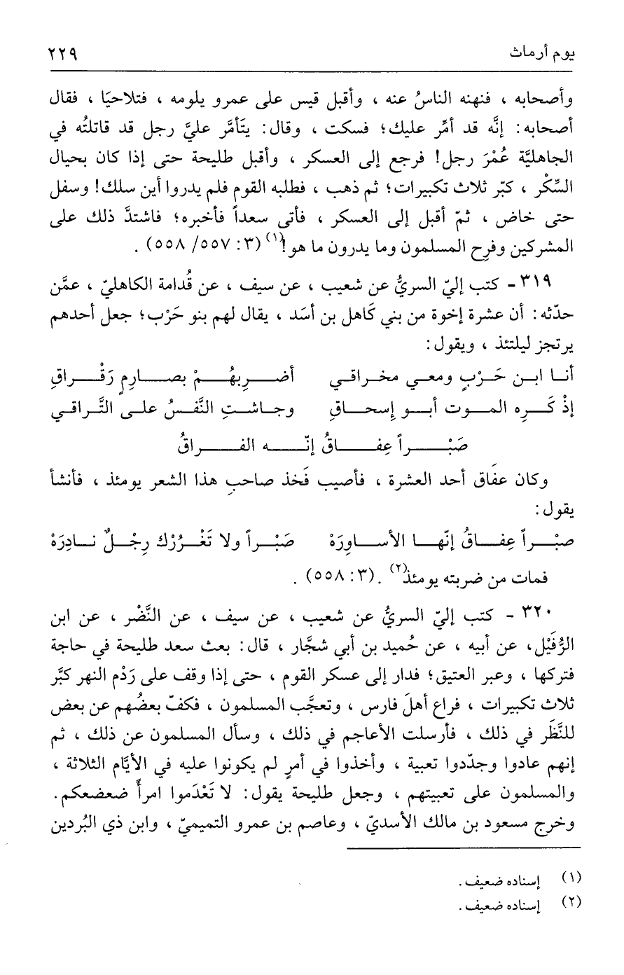 ٣٢٠ - كتب إليّ السريُّ عن شعيب، عن سيف، عن النَّضْر، عن ابن الرُّفَيْل، عن أبيه، عن حُميد بن أبي شجَّار، قال: بعث سعد طليحة في حاجة فتركها، وعبر العتيق؛ فدار إلى عسكر القوم، حتى إذا وقف على رَدْم النهر كبَّر ثلاث تكبيرات، فراع أهلَ فارس، وتعجَّب المسلمون، فكفّ بعضُهم عن بعض للنَّظَر في ذلك، فأرسلت الأعاجم في ذلك، وسأل المسلمون عن ذلك، ثم إنهم عادوا وجدّدوا تعبية، وأخذوا في أمرٍ لم يكونوا عليه في الأيَّام الثلاثة، والمسلمون على تعبيتهم، وجعل طليحة يقول: لا تَعْدَموا امرأً ضعضعكم. وخرج مسعود بن مالك الأسديّ، وعاصم بن عمرو التميميّ، وابن ذي البُردين