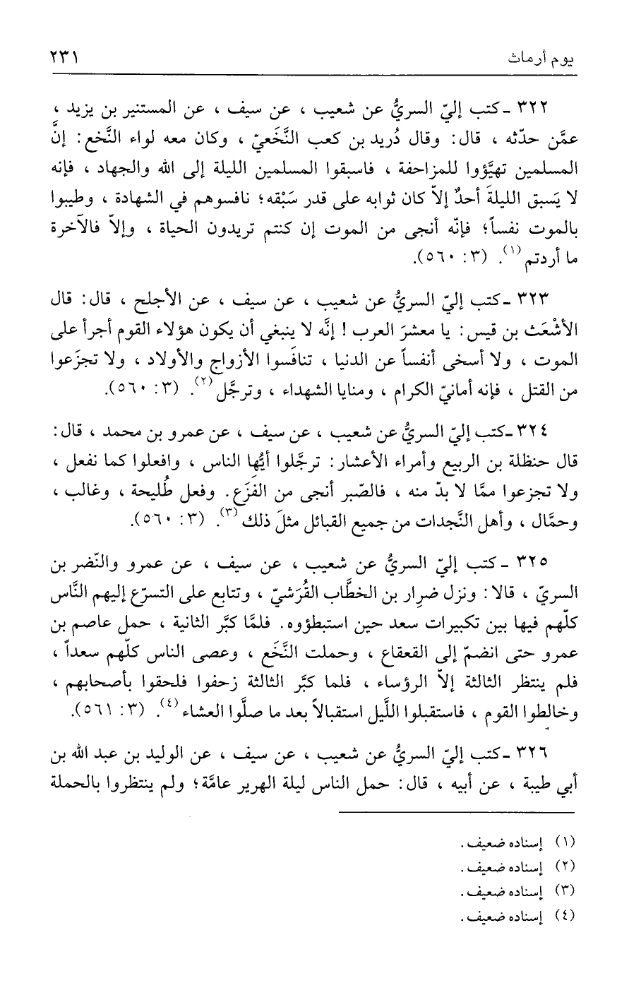 ٣٢٣ - كتب إليّ السريُّ عن شعيب، عن سيف، عن الأجلح، قال: قال الأشْعَث بن قيس: يا معشرَ العرب! إنَّه لا ينبغي أن يكون هؤلاء القوم أجرأ على الموت، ولا أسخى أنفسًا عن الدنيا، تنافَسوا الأزواج والأولاد، ولا تجزَعوا من القتل، فإنه أمانيّ الكرام، ومنايا الشهداء، وترجَّل (٢). (٣: ٥٦٠).