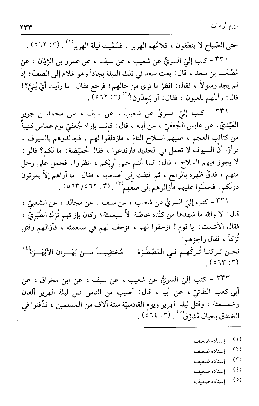 ٣٣٣ - كتب إليّ السريُّ عن شعيب، عن سيف، عن ابن مخراق، عن أبي كعب الطائيّ، عن أبيه، قال: أصيب من الناس قبل ليلة الهرير ألفان وخمسمئة، وقتل ليلة الهرير ويوم القادسيّة ستة آلاف من المسلمين، فدُفنوا في الخندق بحيال مُشرِّق (٥). (٣: ٥٦٤).