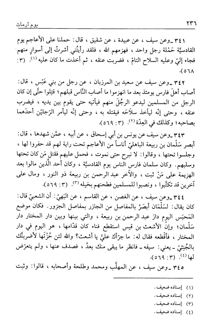٣٤٢ - وعن سيف عن سعيد بن المرزبان، عن رجل من بني عَبْس، قال: أصاب أهلَ فارس يومئذ بعد ما انهزموا ما أصاب النَّاس قبلهم؛ قتِلوا حتَّى إن كان الرجل من المسلمين ليدعو الرجُلَ منهم فيأتيه حتى يقوم بين يديه، فيضرب عنقه، وحتى إنّه ليأخذ سلاحَه فيقتله به، وحتى إنّه ليأمر الرّجليْن أحدَهما بصاحبه؛ وكذلك في العِدّة (٢). (٣: ٥٦٩).