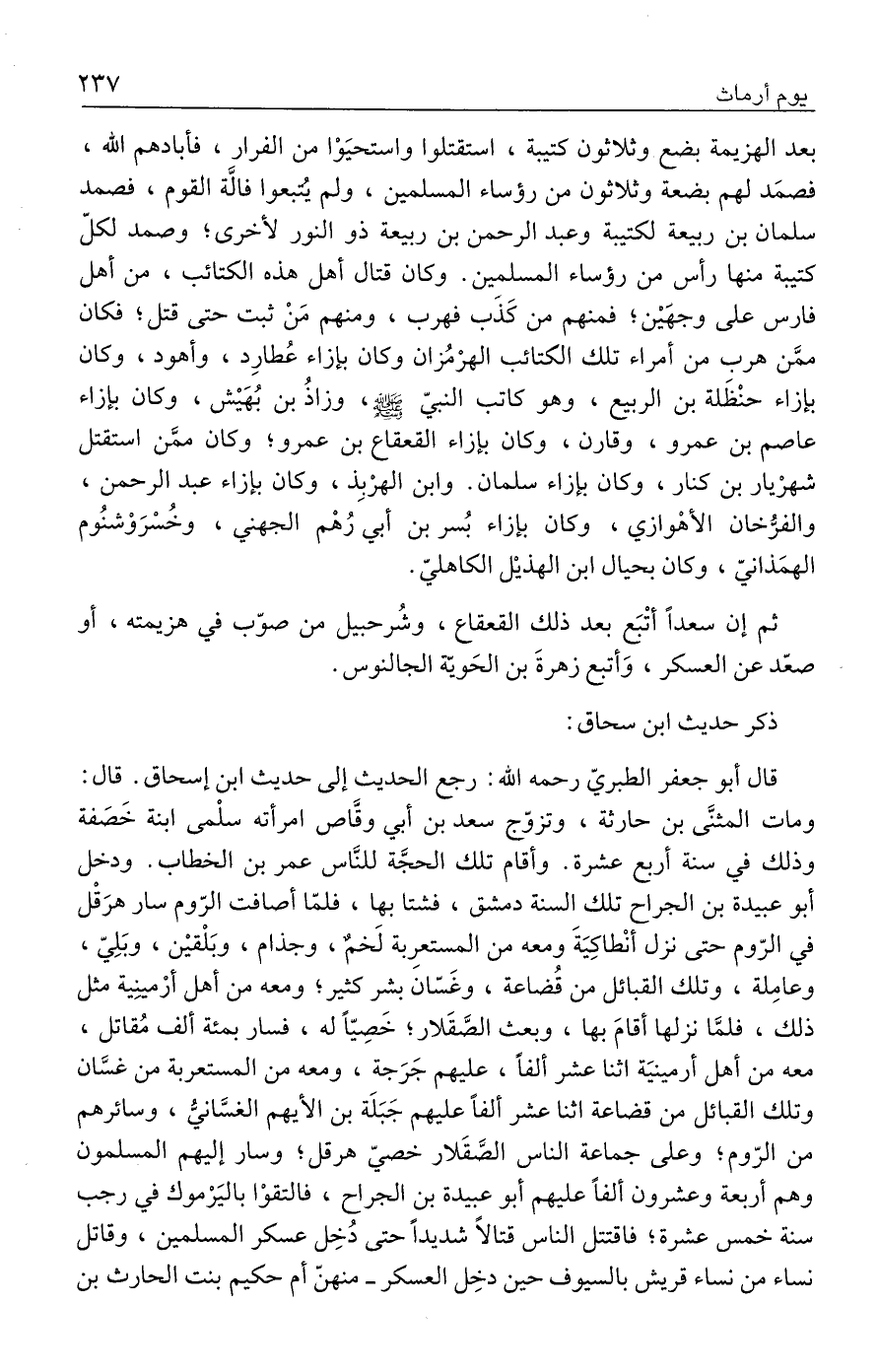 قال أبو جعفر الطبريّ رحمه الله: رجع الحديث إلى حديث ابن إسحاق. قال: ومات المثنَّى بن حارثة، وتزوّج سعد بن أبي وقَّاص امرأته سلْمى ابنة خَصَفة وذلك في سنة أربع عشرة. وأقام تلك الحجَّة للنَّاس عمر بن الخطاب. ودخل أبو عبيدة بن الجراح تلك السنة دمشق، فشتا بها، فلمّا أصافت الرّوم سار هرَقْل في الرّوم حتى نزل أنْطاكِيَةَ ومعه من المستعرِبة لَخمٌ، وجذام، وبَلْقيْن، وبَلِيّ، وعامِلة، وتلك القبائل من قُضاعة، وغَسّان بشر كثير؛ ومعه من أهك أرْمينِية مثل ذلك، فلمَّا نزلها أقامَ بها، وبعث الصَّقَلار؛ خَصِيًّا له، فسار بمئة ألف مُقاتل، معه من أهل أرمينيَة اثنا عشر ألفًا، عليهم جَرَجة، ومعه من المستعربة من غسَّان وتلك القبائل من قضاعة اثنا عشر ألفًا عليهم جَبَلَة بن الأيهم الغسَّانيُّ، وسائرهم من الرّوم، وعلى جماعة الناس الصَّقَلار خصيّ هرقل؛ وسار إليهم المسلمون وهم أربعة وعشرون ألفًا عليهم أبو عبيدة بن الجراح، فالتقوْا باليَرْموك في رجب سنة خمس عشرة؛ فاقتتل الناس قتالًا شديدًا حتى دُخِل عسكر المسلمين، وقاتل نساء من نساء قريش بالسيوف حين دخِل العسكر -منهنّ أم حكيم بنت الحارث بن