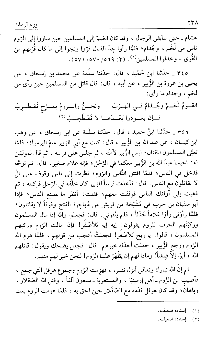 ٣٤٦ - حدّثنا ابنُ حميد، قال: حدّثنا سلَمة عن ابن إسحاق، عن وهب بن كيسان، عن عبد الله بن الزُّبير، قال: كنت مع أبي الزبير عامَ اليرموك؛ فلمَّا تعبَّى المسلمون للقتال؛ لبس الزُّبير لأمتَه، ثم جلس على فرسه، ثم قال لموليَين له: احبسا عبدَ الله بن الزُّبير معكما في الرَّحْل؛ فإنه غلام صغير. قال: ثم توجَّه فدخل في الناس؛ فلمّا اقتتل النَّاس والرّوم؛ نظرت إلى ناس وقوف على تلّ لا يقاتلون مع الناس. قال: فأخذت فرسًا للزبير كان خلَّفه في الرّحل فركبته، ثم ذهبت إلى أولئك الناس فوقفت معهم؛ فقلت: انظر ما يصنع الناس؛ فإذا أبو سفيان بن حرب في مَشْيَخة من قريش من مُهاجِرة الفتح وقوفًا لا يقاتلون؛ فلمَّا رأوْني رأوْا غلامًا حَدَثًا، فلم يتَّقوني. قال: فجعلوا والله إذا مال المسلمون وركبَتْهم الحرب للروم يقولون: إيه إيه بَلأصْفَر! فإذا مالت الرّوم وركبهم المسلمون، قالوا: يا ويح بَلأصفَر! فجعلتُ أعجب من قولهم، فلمَّا هزم الله الرّوم ورجع الزُّبير، جعلت أحدّثه خبرهم. قال: فجعل يضحك ويقول: قاتلهم الله، أبوْا إلّا ضِغنًا! وماذا لهم إن يَظْهَرْ علينا الرّوم! لنحن خير لهم منهم.