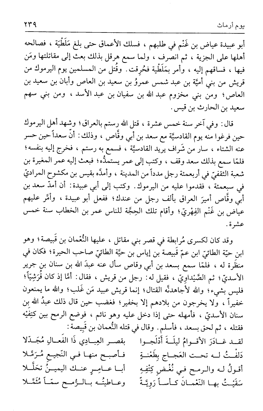 أبو عبيدة عياض بن غَنْم في طلبهم، فسلك الأعماق حتى بلغ مَلَطْيَة، فصالحه أهلها على الجزية، ثم انصرف، ولما سمع هرقل بذلك بعث إلى مقاتلتها ومَن فيها، فساقهم إليه، وأمر بمَلَطية فحُرِقت. وقُتل من المسلمين يوم اليرموك من قريش من بني أميَّة بن عبد شمس عمروُ بن سعيد بن العاص وأبان بن سعيد بن العاص؛ ومن بني مخزوم عبد الله بن سفيان بن عبد الأسد، ومن بني سهم سعيد بن الحارث بن قيس.