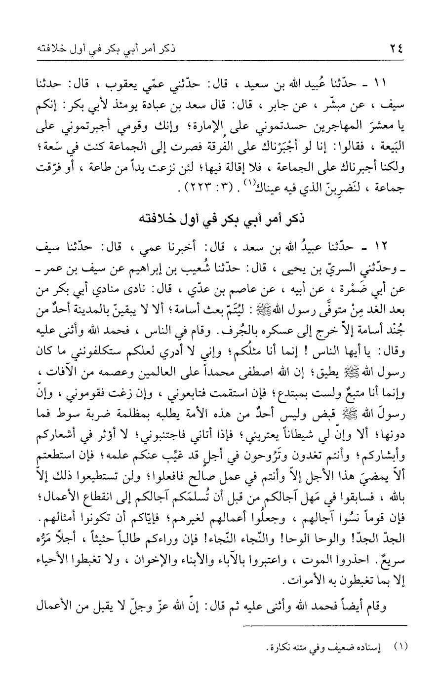 ١١ - حدَّثنا عُبيد الله بن سعيد، قال: حدّثني عمّي يعقوب، قال: حدثنا سيف، عن مبشّر، عن جابر، قال: قال سعد بن عبادة يومئذ لأبي بكر: إنكم يا معشرَ المهاجرين حسدتموني على الإمارة؛ وإنك وقومي أجبرتموني على البَيعة، فقالوا: إنا لو أجْبَرناك على الفُرقة فصرت إلى الجماعة كنت في سَعة؛ ولكنا أجبرناك على الجماعة، فلا إقالة فيها؛ لئن نزعت يدًا من طاعة، أو فرّقت جماعة، لنَضرِبنّ الذي فيه عيناك (١). (٣: ٢٢٣).