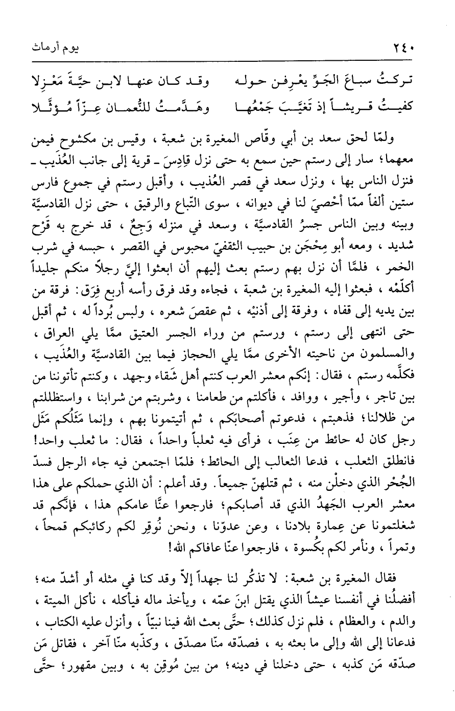 ولمّا لحق سعد بن أبي وقّاص المغيرة بن شعبة، وقيس بن مكشوح فيمن معهما؛ سار إلى رستم حين سمع به حتى نزل قِادِسَ -قرية إلى جانب العُذيب- فنزل الناس بها، ونزل سعد في قصر العُذيب، وأقبل رستم في جموع فارس ستين ألفًا ممّا أحْصيَ لنا في ديوانه، سوى التّباع والرقيق، حتى نزل القادسيَّة وبينه وبين الناس جسرُ القادسيَّة، وسعد في منزله وَجِعٌ، قد خرج به قَرْح شديد، ومعه أبو مِحْجَن بن حبيب الثقفيّ محبوس في القصر، حبسه في شرب الخمر، فلمَّا أن نزل بهم رستم بعث إليهم أن ابعثوا إليَّ رجلًا منكم جليدًا أكلّمْه، فبعثوا إليه المغيرة بن شعبة، فجاءه وقد فرق رأسه أربع فِرَق: فرقة من بين يديه إلى قفاه، وفرقة إلى أذنيْه، ثم عقصَ شعره، ولبس بُردًا له، ثم أقبل حتى انتهى إلى رستم، ورستم من وراء الجسر العتيق ممَّا يلي العراق، والمسلمون من ناحيته الأخرى ممَّا يلي الحجاز فيما بين القادسيَّة والعُذَيب، فكلَّمه رستم، فقال: إنكم معشر العرب كنتم أهل شَقاء وجهد، وكنتم تأتوننا من بين تاجر، وأجير، ووافد، فأكلتم من طعامنا، وشربتم من شرابنا، واستظللتم من ظلالنا؛ فذهبتم، فدعوتم أصحابَكم، ثم أتيتمونا بهم، وإنما مَثَلُكم مَثَل رجل كان له حائط من عِنَب، فرأى فيه ثعلبًا واحدًا، فقال: ما ثعلب واحد! فانطلق الثعلب، فدعا الثعالب إلى الحائط؛ فلمّا اجتمعن فيه جاء الرجل فسدّ الجُحْر الذي دخلْن منه، ثم قتلهنّ جميعًا. وقد أعلم: أن الذي حملكم على هذا معشر العرب الجَهدُ الذي قد أصابكم؛ فارجعوا عنَّا عامكم هذا، فإنَّكم قد شغلتمونا عن عِمارة بلادنا، وعن عدوّنا، ونحن نُوقِر لكم ركائبكم قمحًا، وتمرًا، ونأمر لكم بكُسوة، فارجعوا عنّا عافاكم الله!