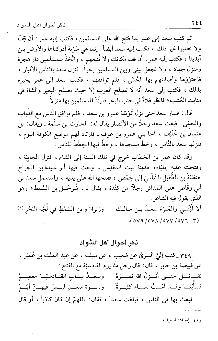 ٣٤٩ - كتب إليَّ السريُّ عن شعيب، عن سيف، عن عبد الملك بن عُمَيْر، عن قَبيصة بن جابر، قال: قال رجل منَّا يوم القادسيَّة مع الفتح: