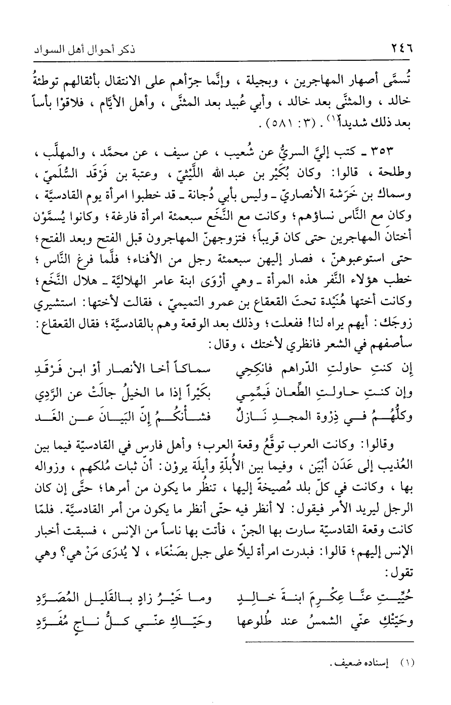 ٣٥٣ - كتب إليَّ السريُّ عن شُعيب، عن سيف، عن محمَّد، والمهلَّب، وطلحة، قالوا: وكان بُكَيْر بن عبد الله اللَّيْثيّ، وعتبة بن فَرْقَد السُّلَميّ، وسماك بن خَرَشة الأنصاريّ -وليس بأبي دُجانة- قد خطبوا امرأة يوم القادسيَّة، وكان مع النَّاس نساؤهم؛ وكانت مع النَّخَع سبعمئة امرأة فارغة؛ وكانوا يُسمَّوْن أختانَ المهاجرين حتى كان قريبًا؛ فتزوجهنّ المهاجرون قبل الفتح وبعد الفتح؛ حتى استوعبوهنّ، فصار إليهن سبعمئة رجل من الأفناء؛ فلَّما فرغ النَّاس؛ خطب هؤلاء النَّفر هذه المرأة -وهي أرْوَى ابنة عامر الهلاليَّة- هلال النَّخَع؛ وكانت أختها هُنَيْدة تحتَ القعقاع بن عمرو التميميّ، فقالت لأختها: استشيري زوجَك: أيهم يراه لنا! ففعلت؛ وذلك بعد الوقعة وهم بالقادسيَّة؛ فقال القعقاع: سأصفهم في الشعر فانظري لأختك، وقال: