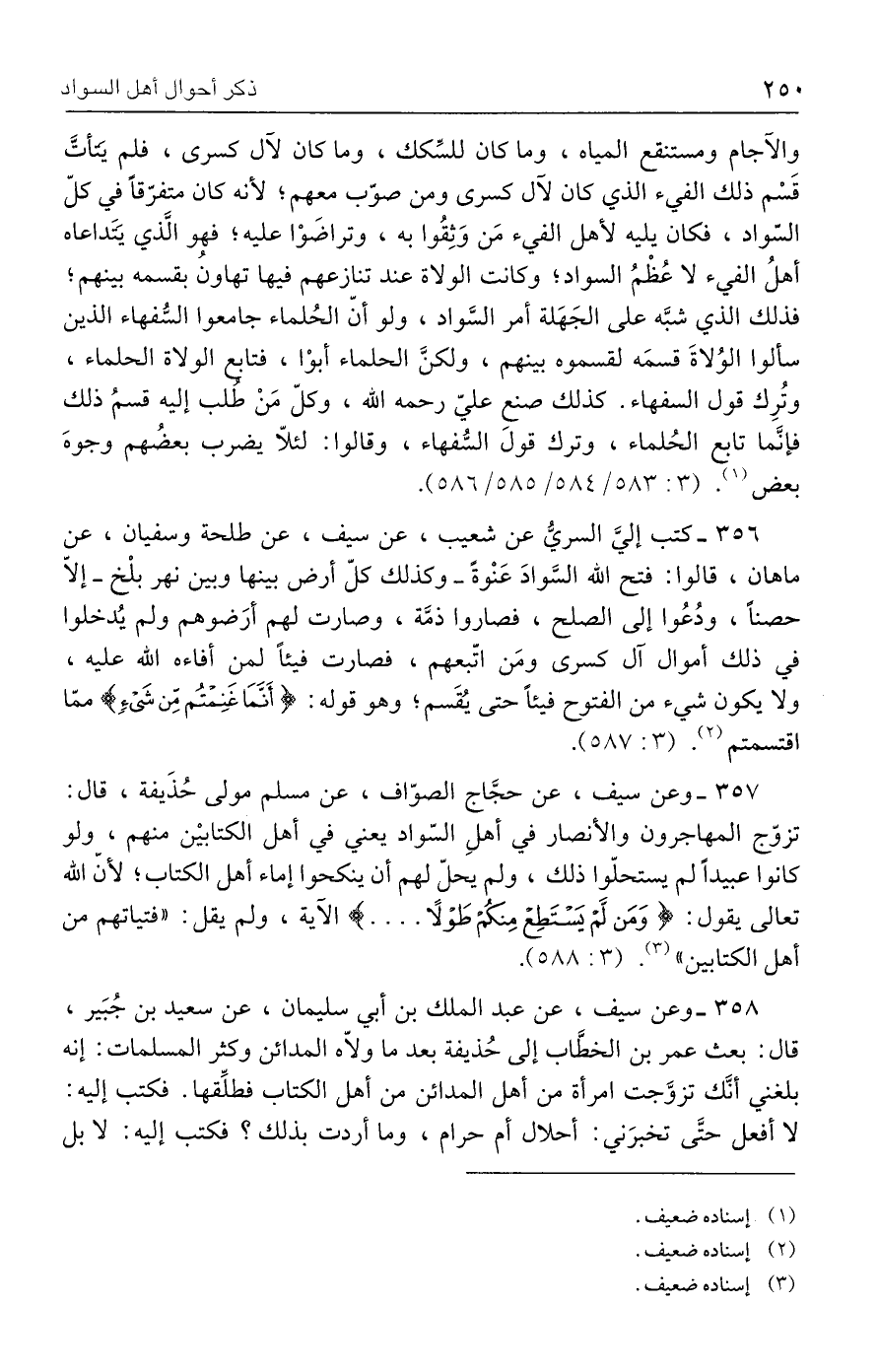 ٣٥٧ - وعن سيف، عن حجَّاج الصوّاف، عن مسلم مولى حُذَيفة، قال: تزوّج المهاجرون والأنصار في أهلِ السّواد يعني في أهل الكتابيْن منهم، ولو كانوا عبيدًا لم يستحلّوا ذلك، ولم يحلّ لهم أن ينكحوا إماء أهل الكتاب؛ لأنّ الله تعالى يقول: {وَمَنْ لَمْ يَسْتَطِعْ مِنْكُمْ طَوْلًا} الآية، ولم يقل: "فتياتهم من أهل الكتابين" (٣). (٣: ٣٨٨).