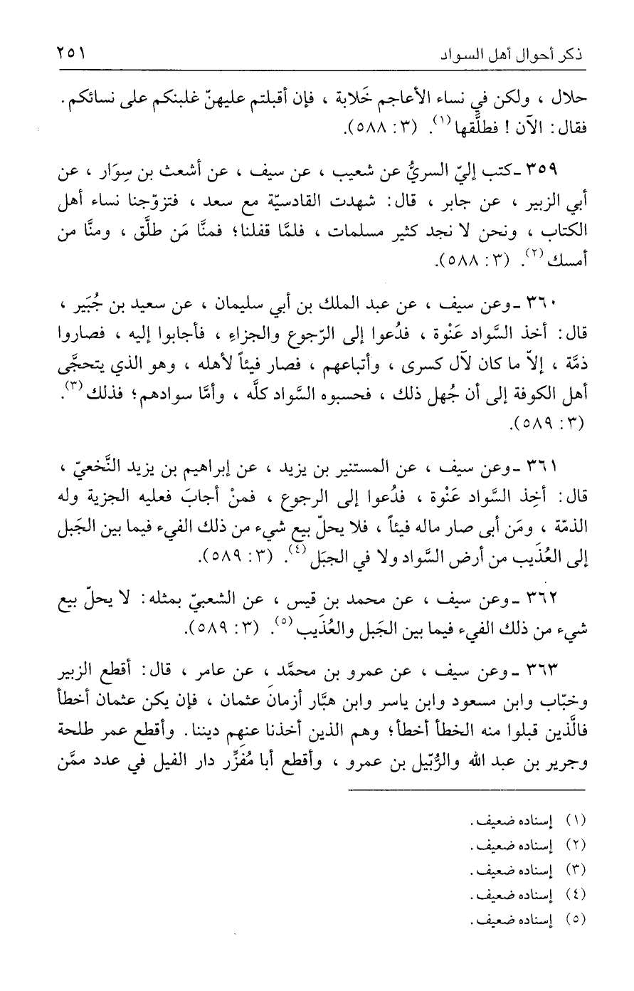٣٦١ - وعن سيف، عن المستنير بن يزيد، عن إبراهيم بن يزيد النَّخعيّ، قال: أخِذ السَّواد عَنْوة، فدُعوا إلى الرجوع، فمنْ أجابَ فعليه الجزية وله الذمّة، ومَن أبى صار ماله فيئًا، فلا يحلّ بيع شيء من ذلك الفيء فيما بين الجَبل إلى العُذَيب من أرض السَّواد ولا في الجبَل (٤). (٣: ٥٨٩).