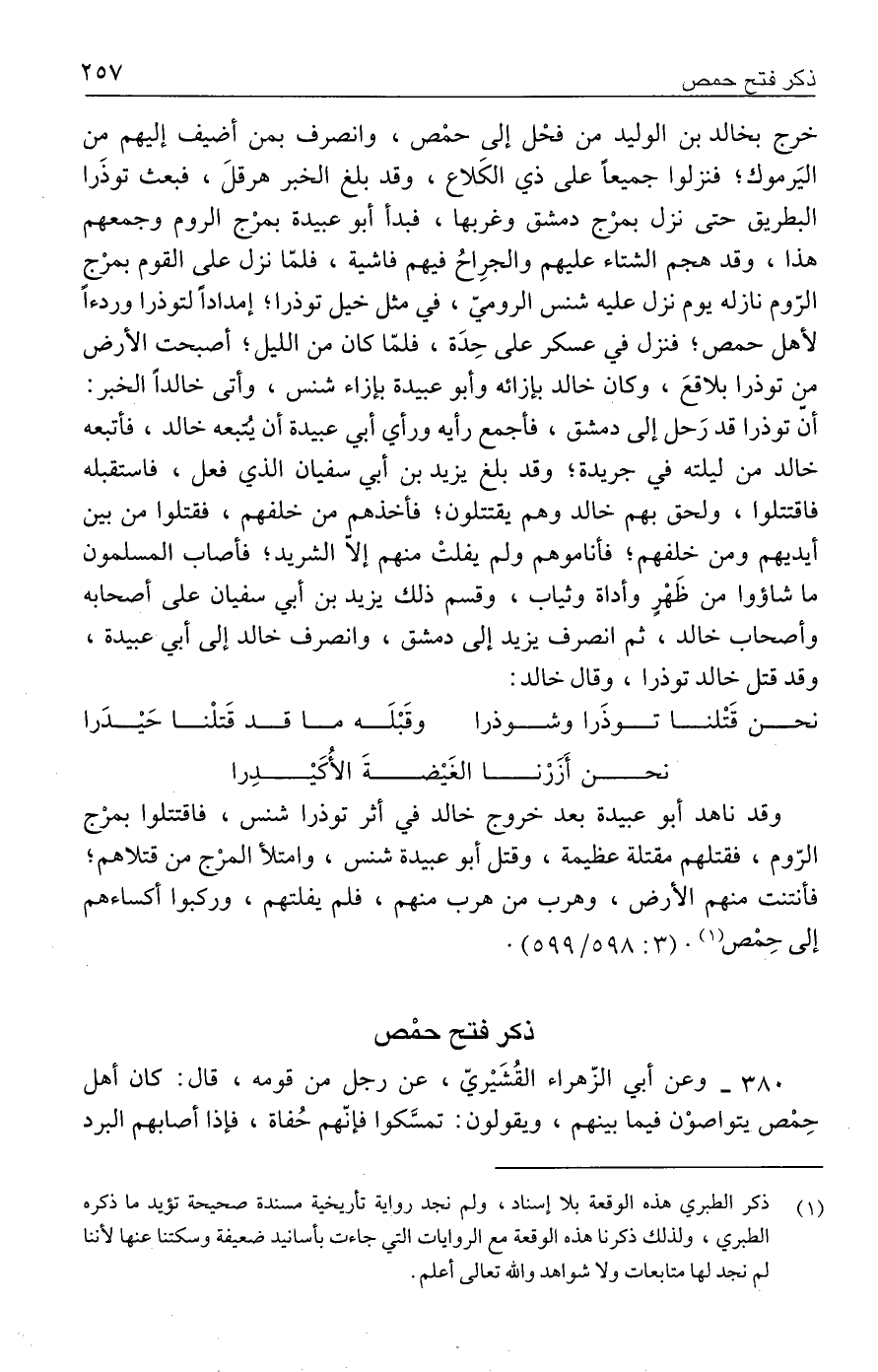(١) ذكر الطبري هذه الوقعة بلا إسناد، ولم نجد رواية تأريخية مسندة صحيحة تؤيد ما ذكره الطبري، ولذلك ذكرنا هذه الوقعة مع الروايات التي جاءت بأسانيد ضعيفة وسكتنا عنها لأننا لم نجد لها متابعات ولا شواهد والله تعالى أعلم.