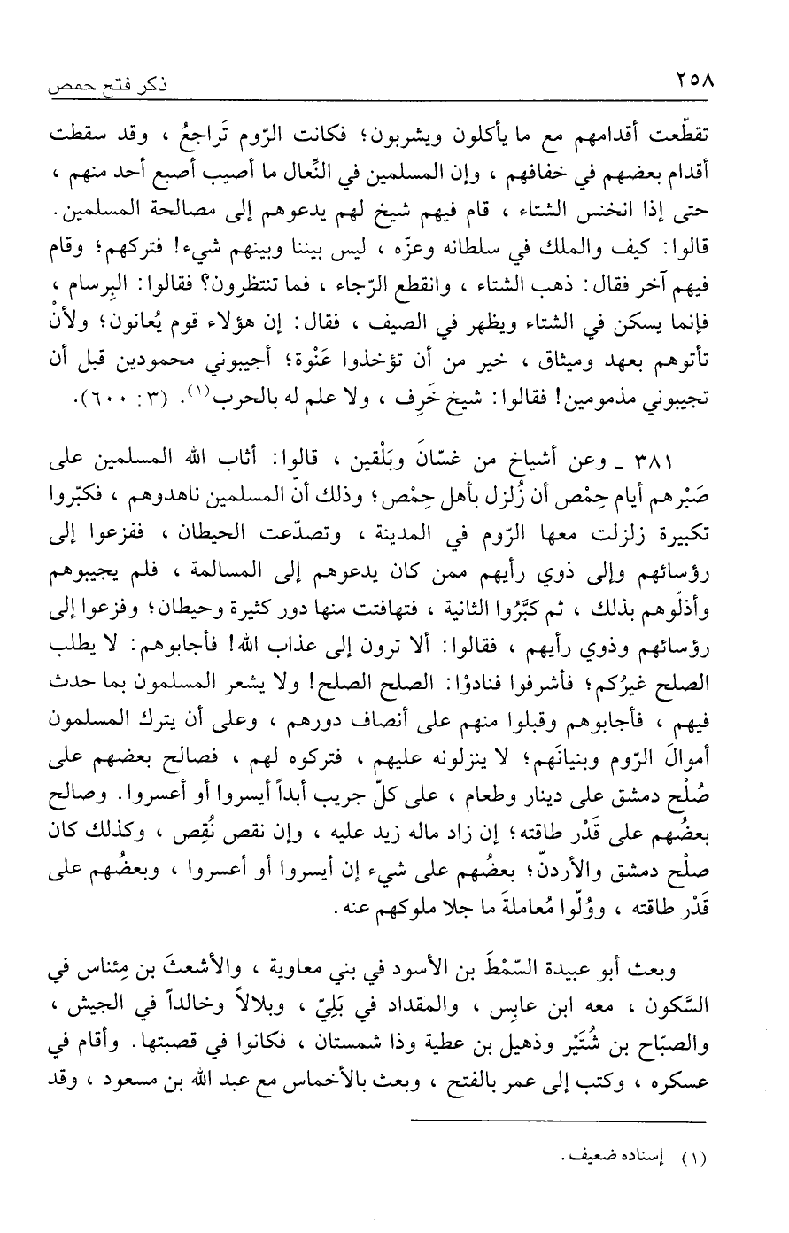 ٣٨١ - وعن أشياخ من غسّانَ وبَلْقين، قالوا: أثاب الله المسلمين على صَبْرهم أيام حِمْص أن زُلزل بأهل حِمْص؛ وذلك أنّ المسلمين ناهدوهم، فكبّروا تكبيرة زلزلت معها الرّوم في المدينة، وتصدّعت الحيطان، ففزعوا إلى رؤسائهم وإلى ذوي رأيهم ممن كان يدعوهم إلى المسالمة، فلم يجيبوهم وأذلّوهم بذلك، ثم كبَّرُوا الثانية، فتهافتت منها دور كثيرة وحيطان؛ وفزعوا إلى رؤسائهم وذوي رأيهم، فقالوا: ألا ترون إلى عذاب الله! فأجابوهم: لا يطلب الصلح غيرُكم؛ فأشرفوا فنادوْا: الصلح الصلح! ولا يشعر المسلمون بما حدث فيهم، فأجابوهم وقبلوا منهم على أنصاف دورهم، وعلى أن يترك المسلمون أموالَ الرّوم وبنيانَهم؛ لا ينزلونه عليهم، فتركوه لهم، فصالح بعضهم على صُلْح دمشق على دينار وطعام، على كلّ جريب أبدًا أيسروا أو أعسروا. وصالح بعضُهم على قَدْر طاقته؛ إن زاد ماله زيد عليه، وإن نقص نُقِص، وكذلك كان صلْح دمشق والأردنّ؛ بعضُهم على شيء إن أيسروا أو أعسروا، وبعضُهم على قَدْر طاقته، ووُلّوا مُعاملةَ ما جلا ملوكهم عنه.