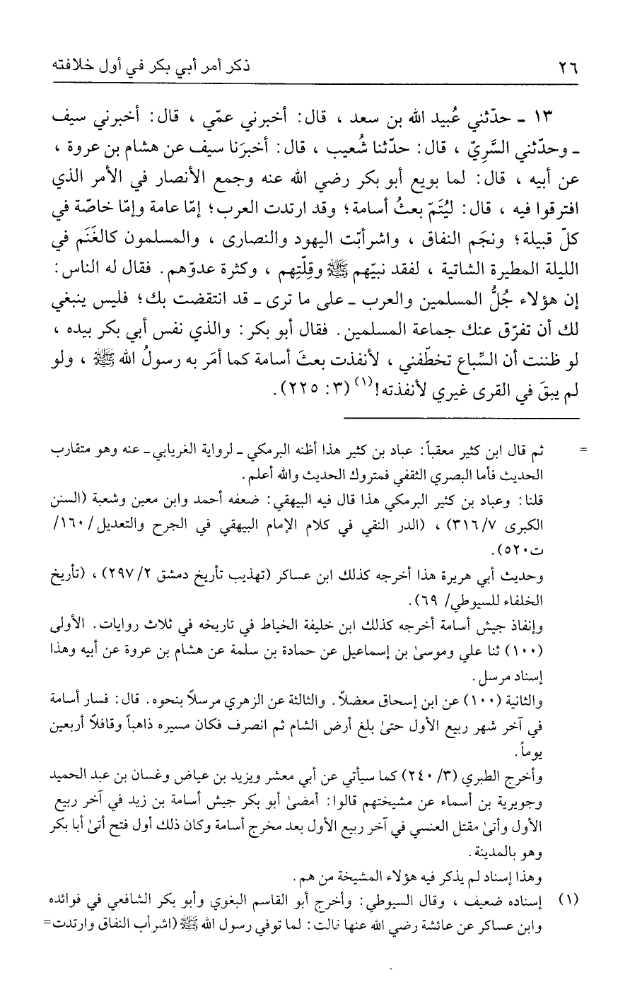 ١٣ - حدّثني عُبيد الله بن سعد، قال: أخبرني عمّي، قال: أخبرني سيف - وحدّثني السَّرِيّ، قال: حدَّثنا شُعيب، قال: أخبرَنا سيف عن هشام بن عروة، عن أبيه، قال: لما بويع أبو بكر رضي الله عنه وجمع الأنصار في الأمر الذي افترقوا فيه، قال: ليُتَمّ بعثُ أسامة؛ وقد ارتدت العرب؛ إمّا عامة وإمّا خاصة في كلّ قبيلة؛ ونجَم النفاق، وأشرأبّت اليهود والنصارى، والمسلمون كالغَنَم في الليلة المطيرة الشاتية، لفقد نبيّهم - صلى الله عليه وسلم - وقِلّتِهم، وكثرة عدوّهم. فقال له الناس: إن هؤلاء جُلُّ المسلمين والعرب - على ما ترى - قد انتقضت بك؛ فليس ينبغي لك أن تفرّق عنك جماعة المسلمين. فقال أبو بكر: والذي نفس أبي بكر بيده، لو ظننت أن السِّباع تخطّفني، لأنفذت بعثَ أسامة كما أمَر رسولُ الله - صلى الله عليه وسلم -، ولو لم يبقَ في القرى غيري لأنفذته! (١) (٣: ٢٢٥).