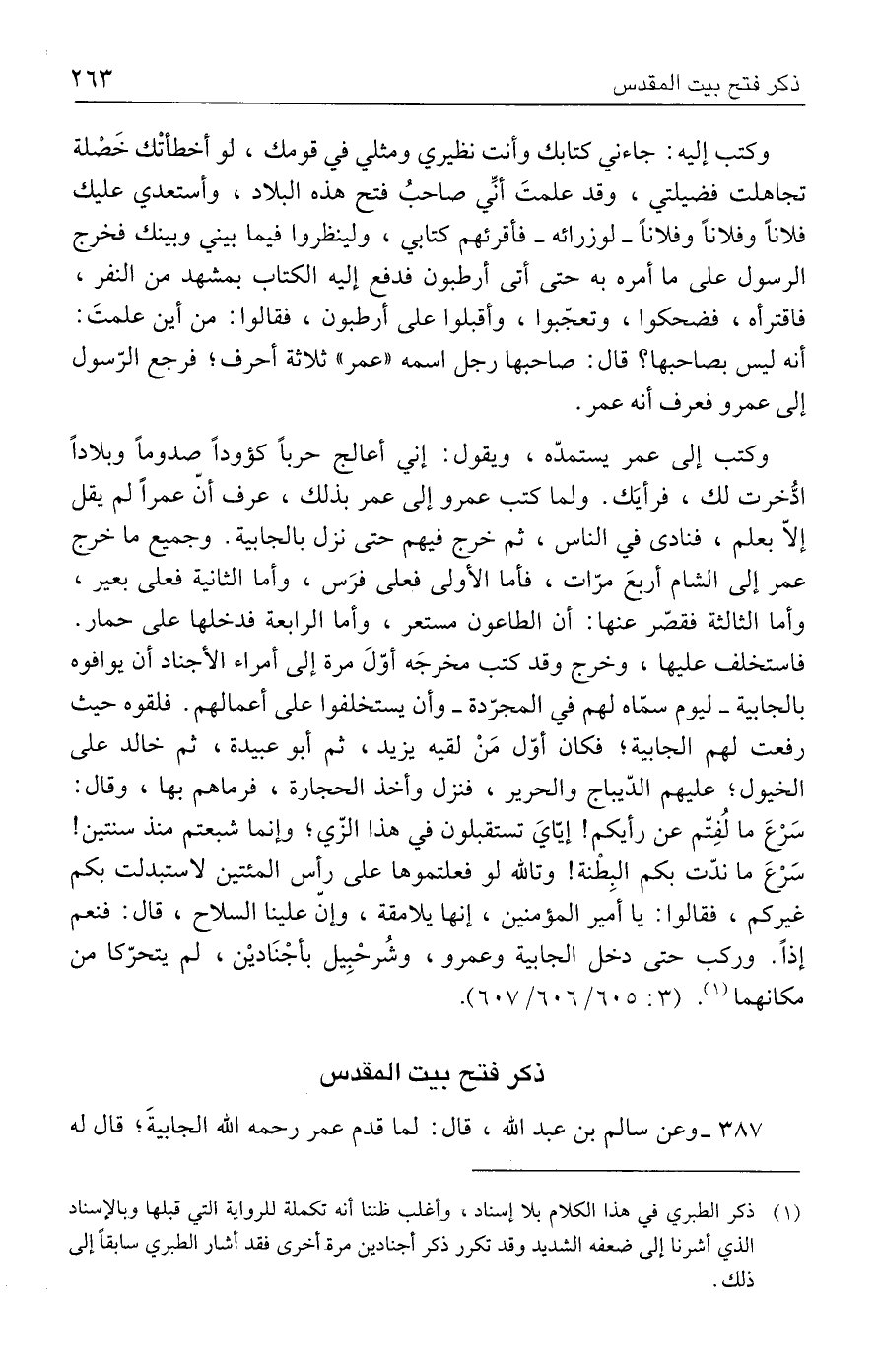 (١) ذكر الطبري في هذا الكلام بلا إسناد، وأغلب ظننا أنه تكملة للرواية التي قبلها وبالإسناد الذي أشرنا إلى ضعفه الشديد وقد تكرر ذكر أجنادين مرة أخرى فقد أشار الطبري سابقًا إلى ذلك.