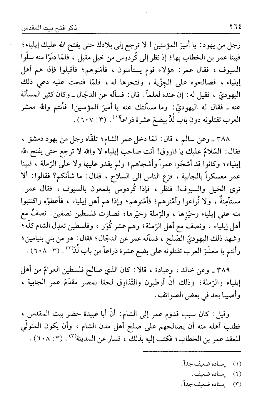 ٣٨٨ - وعن سالم، قال: لمّا دخل عمر الشام؛ تلقّاه رجل من يهود دمشق، فقال: السّلامُ عليك يا فاروق! أنت صاحب إيلياء لا والله لا ترجع حتى يفتح الله إيلياء؛ وكانوا قد أشجَوا عمرًا وأشجاهم؛ ولم يقدر عليها ولا على الرّملة، فبينا عمر معسكرًا بالجابية، فزع الناس إلى السلاح، فقال: ما شأنكم؟ فقالوا: ألا ترى الخيل والسيوف! فنظر، فإذا كُردوس يلمعون بالسيوف، فقال عمر: مستأمِنةٌ، ولا تُراعوا وأمِّنوهم؛ فأمّنوهم؛ وإذا هم أهل إيلياء، فأعطوْه واكتتبوا منه على إيلياء وحيّزِها، والرّملة وحيّزها؛ فصارت فلسطين نصفين: نصفٌ مع أهل إيلياء، ونصف مع أهل الرّملة؛ وهم عشر كُوَر، وفلسطين تعدِل الشام كلّه؛ وشهد ذلك اليهوديّ الصّلح، فسأله عمر عن الدجّال؛ فقال: هو من بني بنيامين؛ وأنتم يا معشَرَ العرب تقتلونه على بضع عشرة ذراعًا من باب لُدّ (٢). (٣: ٦٠٨).