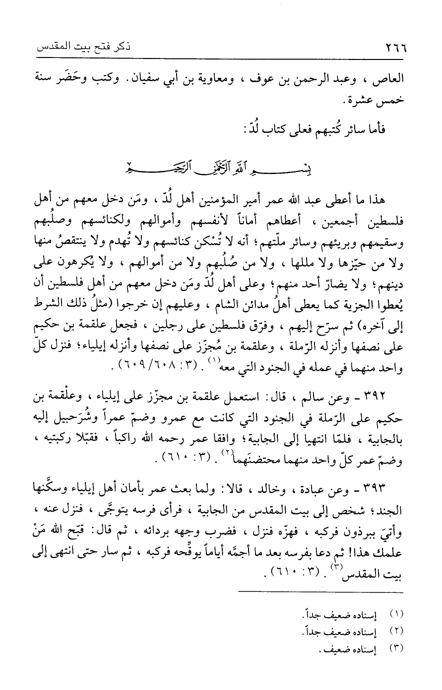 هذا ما أعطى عبد الله عمر أمير المؤمنين أهل لُدّ، ومَن دخل معهم من أهل فلسطين أجمعين، أعطاهم أمانًا لأنفسهم وأموالهم ولكنائسهم وصلُبهم وسقيمهم وبريئهم وسائر ملّتهم، أنه لا تُسْكن كنائسهم ولا تُهدم ولا ينتقصُ منها ولا من حيّزها ولا مللها، ولا من صُلُبهم ولا من أموالهم، ولا يُكرهون على دينهم؛ ولا يضارّ أحد منهم؛ وعلى أهل لُدّ ومَن دخل معهم من أهل فلسطين أن يُعطوا الجزية كما يعطى أهلُ مدائن الشام، وعليهم إن خرجوا (مثلُ ذلك الشرط إلى آخره) ثم سرّح إليهم، وفرّق فلسطين على رجلين، فجعل علقمة بن حكيم على نصفها وأنزله الرّملة، وعلقمة بن مُجزّز على نصفها وأنزله إيلياء؛ فنزل كلّ واحد منهما في عمله في الجنود التي معه (١). (٣: ٦٠٨/ ٦٠٩).