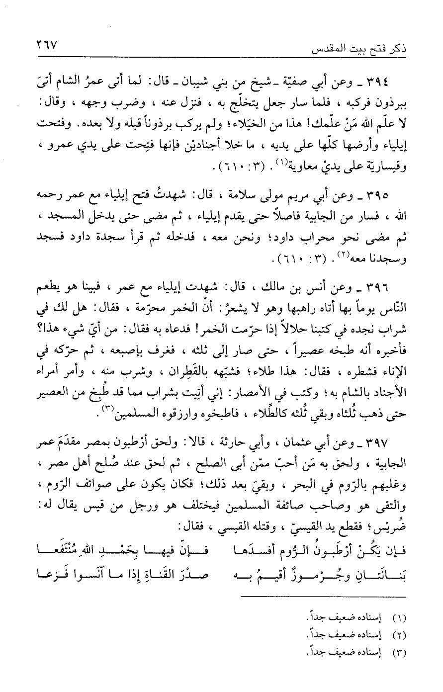 ٣٩٤ - وعن أبي صفيّة -شيخ من بني شيبان- قال: لما أتى عمرُ الشام أتىَ ببرذون فركبه، فلما سار جعل يتخلّج به، فنزل عنه، وضرب وجهه، وقال: لا علّم الله مَنْ علّمك! هذا من الخيَلاء؛ ولم يركب برذونًا قبله ولا بعده. وفتحت إيلياء وأرضها كلّها على يديه، ما خلا أجناديْن فإنها فتِحت على يدي عمرو، وقيساريّة على يديْ معاوية (١). (٣: ٦١٠).