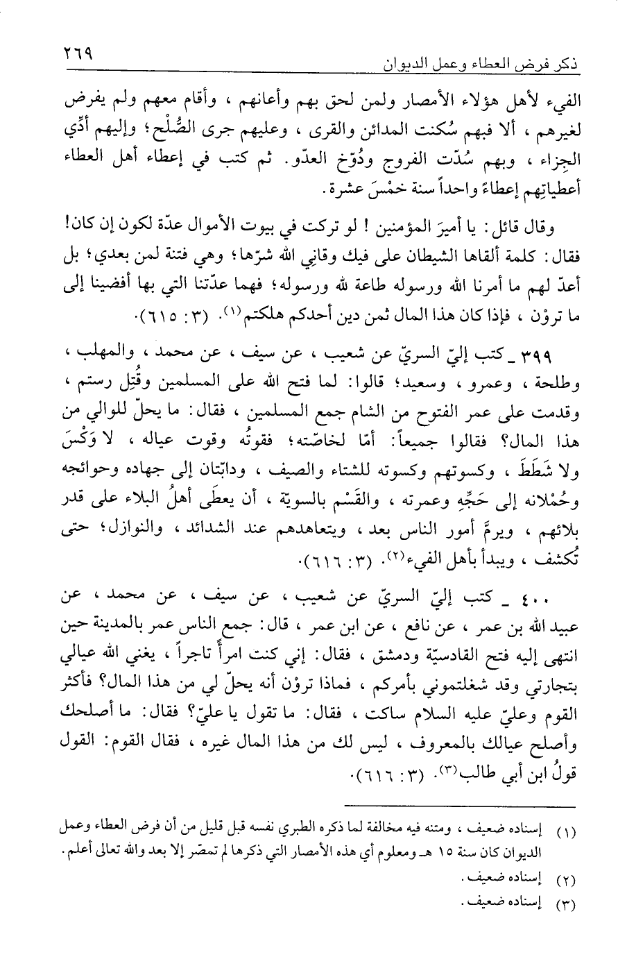 ٣٩٩ - كتب إليّ السريّ عن شعيب، عن سيف، عن محمد، والمهلب، وطلحة، وعمرو، وسعيد؛ قالوا: لما فتح الله على المسلمين وقُتِل رستم، وقدمت على عمر الفتوح من الشام جمع المسلمين، فقال: ما يحلّ للوالي من هذا المال؟ فقالوا جميعًا: أمّا لخاصته؛ فقوتُه وقوت عياله، لا وَكْسَ ولا شَطَطَ، وكسوتهم وكسوته للشتاء والصيف، ودابّتان إلى جهاده وحوائجه وحُمْلانه إلى حَجِّهِ وعمرته، والقَسْم بالسويّة، أن يعطَى أهلُ البلاء على قدر بلائهم، ويرمَّ أمور الحاس بعد، ويتعاهدهم عند الشدائد، والنوازل؛ حتى تُكشف، ويبدأ بأهل الفيء (٢). (٣: ٦١٦).
