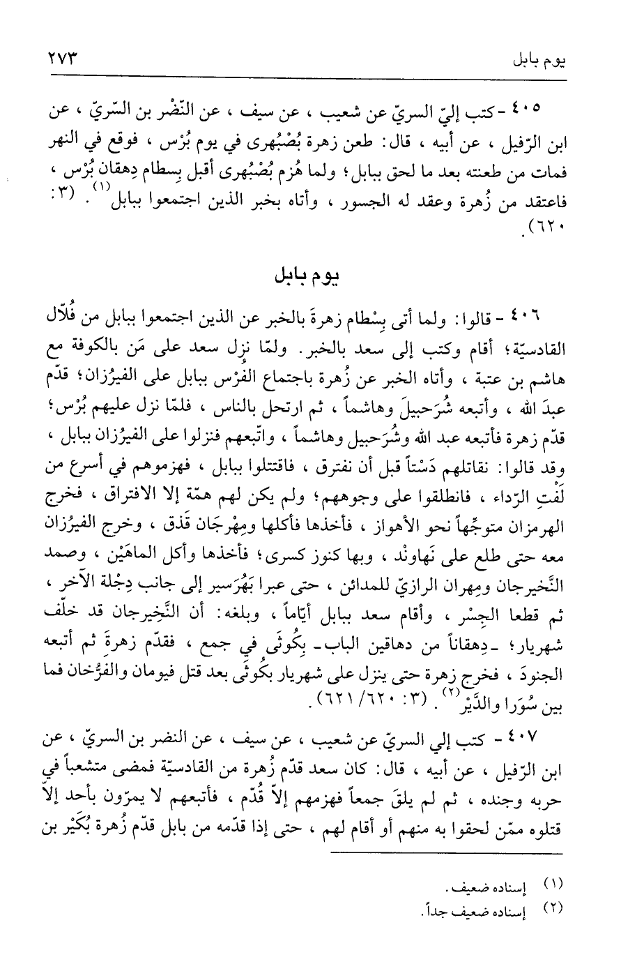 ٤٠٧ - كتب إلي السريّ عن شعيب، عن سيف، عن النضر بن السريّ، عن ابن الرّفيل، عن أبيه، قال: كان سعد قدّم زُهرة من القادسيّة فمضى متشعبًا في حربه وجنده، ثم لم يلقَ جمعًا فهزمهم إلّا قُدّم، فأتبعهم لا يمرّون بأحد إلّا قتلوه ممّن لحقوا به منهم أو أقام لهم، حتى إذا قدّمه من بابل قدّم زُهرة بُكَيْر بن