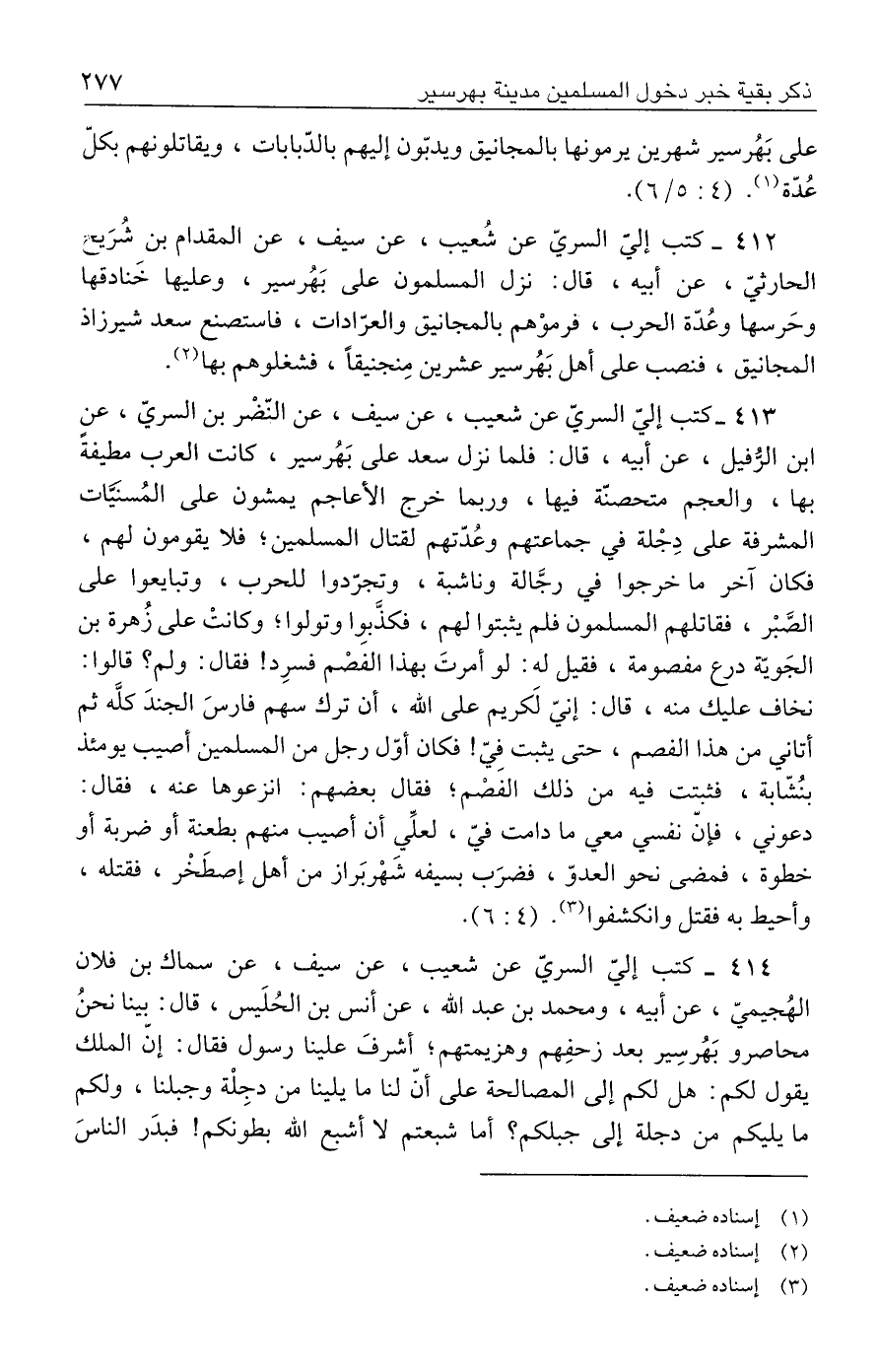 ٤١٤ - كتب إليّ السريّ عن شعيب، عن سيف، عن سماك بن فلان الهُجيميّ، عن أبيه، ومحمد بن عبد الله، عن أنس بن الحُلَيس، قال: بينا نحنُ محاصرو بَهُرسِير بعد زحفِهم وهزيمتهم؛ أشرفَ علينا رسول فقال: إنّ الملك يقول لكم: هل لكم إلى المصالحة على أنّ لنا ما يلينا من دجِلْة وجبلنا، ولكم ما يليكم من دجلة إلى جبلكم؟ أما شبعتم لا أشبع الله بطونكم! فبدَر الناسَ