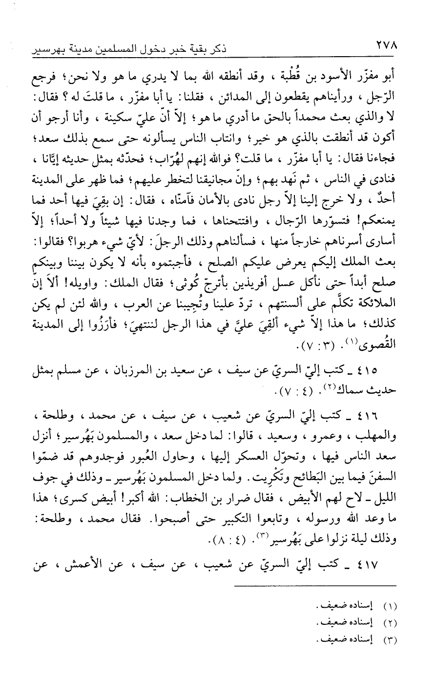 ٤١٦ - كتب إليّ السريّ عن شعيب، عن سيف، عن محمد، وطلحة، والمهلب، وعمرو، وسعيد، قالوا: لما دخل سعد، والمسلمون بَهُرسير؛ أنزل سعد الناس فيها، وتحوّل العسكر إليها، وحاول العُبور فوجدوهم قد ضمّوا السفنَ فيما بين البَطائح وتَكْرِيت. ولما دخل المسلمون بَهُرسير -وذلك في جوف الليل- لاح لهم الأبيض، فقال ضرار بن الخطاب: الله أكبر! أبيض كسرى؛ هذا ما وعد الله ورسوله، وتابعوا التكبير حتى أصبحوا. فقال محمد: وطلحة: وذلك ليلة نزلوا على بَهُرسير (٣). (٤: ٨).