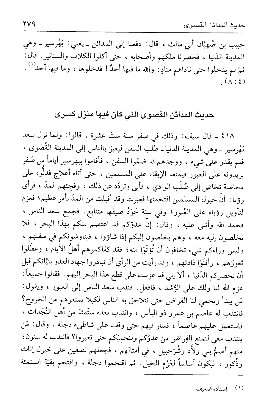 ٤١٨ - قال سيف: وذلك في صفر سنة ستّ عشرة، قالوا: ولما نزل سعد بَهُرسير -وهي المدينة الدنيا- طلب السفن ليعبرَ بالناس إلى المدينة القُصْوى، فلم يقدر على شيء، ووجدهم قد ضمّوا السفن، فأقاموا ببهرسير أيامًا من صَفر يريدونه على العبور فيمنعه الإبقاء على المسلمين، حتى أتاه أعلاج فدلُّوه على مخاضة تخاض إلى صُلْب الوادي، فأبى وتردّد عن ذلك، وفجِئهم المدّ، فرأى رؤيا: أنّ خيول المسلمين اقتحمتها فعبرت وقد أقبلت من المدّ بأمر عظيم؛ فعزم لتأويل رؤياه على العُبور، وفي سنة جَوْدُ صيفها متتابع. فجمع سعد الناس، فحمد الله وأثنى عليه، وقال: إنّ عدوّكم قد اعتصم منكم بهذا البحر، فلا تخلصون إليه معه، وهم يخلصون إليكم إذا شاؤوا، فيناوشونكم في سفنهم، وليس وراءكم شيء تخافون أن تُؤتَوْا منه، فقد كفاكموهم أهلُ الأيام، وعطّلوا ثغورَهم، وأفنَوْا ذادتهم، وقد رأيت من الرأي أن تبادروا جهاد العدو بنيَّاتكم قبل أن تحصركم الدّنيا، ألا إني قد عزمت على قطع هذا البحر إليهم. فقالوا جميعًا: عزم الله لنا ولك على الرُّشد، فافعل. فندب سعد الناس إلى العبور، ويقول: مَن يبدأ ويحمي لنا الفراض حتى تتلاحق به الناس لكيلا يمنعوهم من الخروج؟ فانتدب له عاصم بن عمرو ذو البأس، وانتدب بعده ستّمئة من أهل النَّجَدات، فاستعمل عليهم عاصمًا، فسار فيهم حتى وقف على شاطئ دجلة، وقال: مَن ينتدب معي لنمنع الفِراض من عدوّكم ولنحمِيَكم حتى تعبروا؟ فانتدب له ستون؛ منهم أصمُّ بني ولَّاد وشُرَحبيل، في أمثالهم، فجعلهم نصفين على خيول إناث وذُكور، ليكون أساسًا لعَوْم الخيل. ثم اقتحموا دجلة، واقتحم بقيّة الستمئة