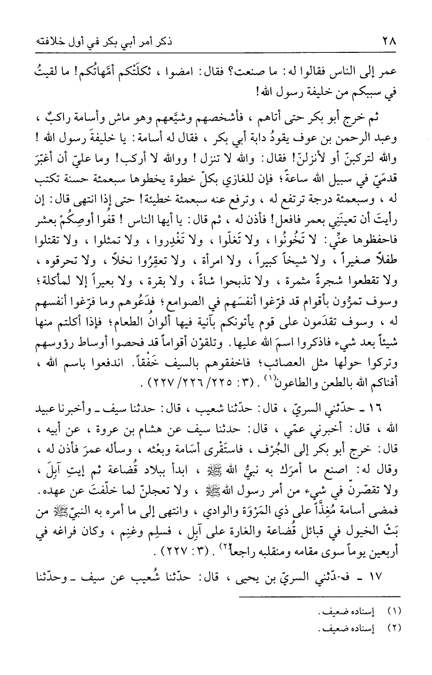 ١٦ - حدّثني السريّ، قال: حدَّثنا شعيب، قال: حدثنا سيف - وأخبرنا عبيد الله، قال: أخبرني عمّي، قال: حدثنا سيف عن هشام بن عروة، عن أبيه، قال: خرج أبو بكر إلى الجُرْف، فاستَقْرى أسَامة وبعْثه، وسأله عمرَ فأذن له، وقال له: اصنع ما أمرَك به نبيُّ الله - صلى الله عليه وسلم -، ابدأ ببلاد قُضاعة ثم إيتِ آبِلَ، ولا تقصّرنّ في شيء من أمر رسول الله - صلى الله عليه وسلم -، ولا تعجلنّ لما خلّفتَ عن عهده. فمضى أسامة مُغِذًّا على ذي المَرْوَة والوادي، وانتهى إلى ما أمره به النبيّ - صلى الله عليه وسلم - من بَثّ الخيول في قبائل قُضاعة والغارة على آبِل، فسلِم وغنِم، وكان فراغه في أربعين يومًا سوى مقامه ومنقلبه راجعا (٢). (٣: ٢٢٧).