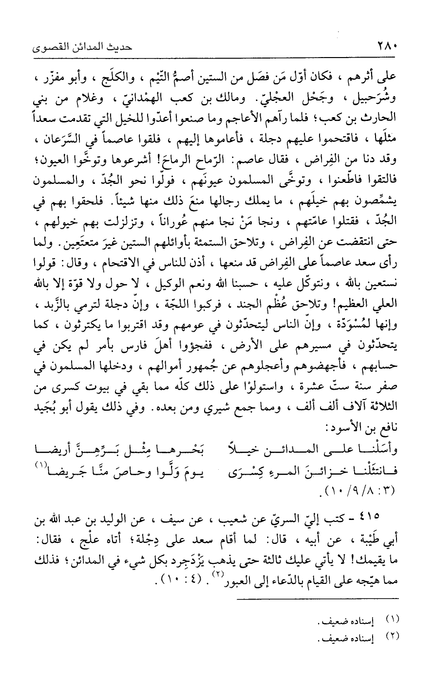 ٤١٥ - كتب إليّ السريّ عن شعيب، عن سيف، عن الوليد بن عبد الله بن أبي طَيْبة، عن أبيه، قال: لما أقام سعد على دِجْلة؛ أتاه علْج، فقال: ما يقيمك! لا يأتي عليك ثالثة حتى يذهب يَزْدَجرد بكل شيء في المدائن؛ فذلك مما هيّجه على القيام بالدّعاء إلى العبور (٢). (٤: ١٠).