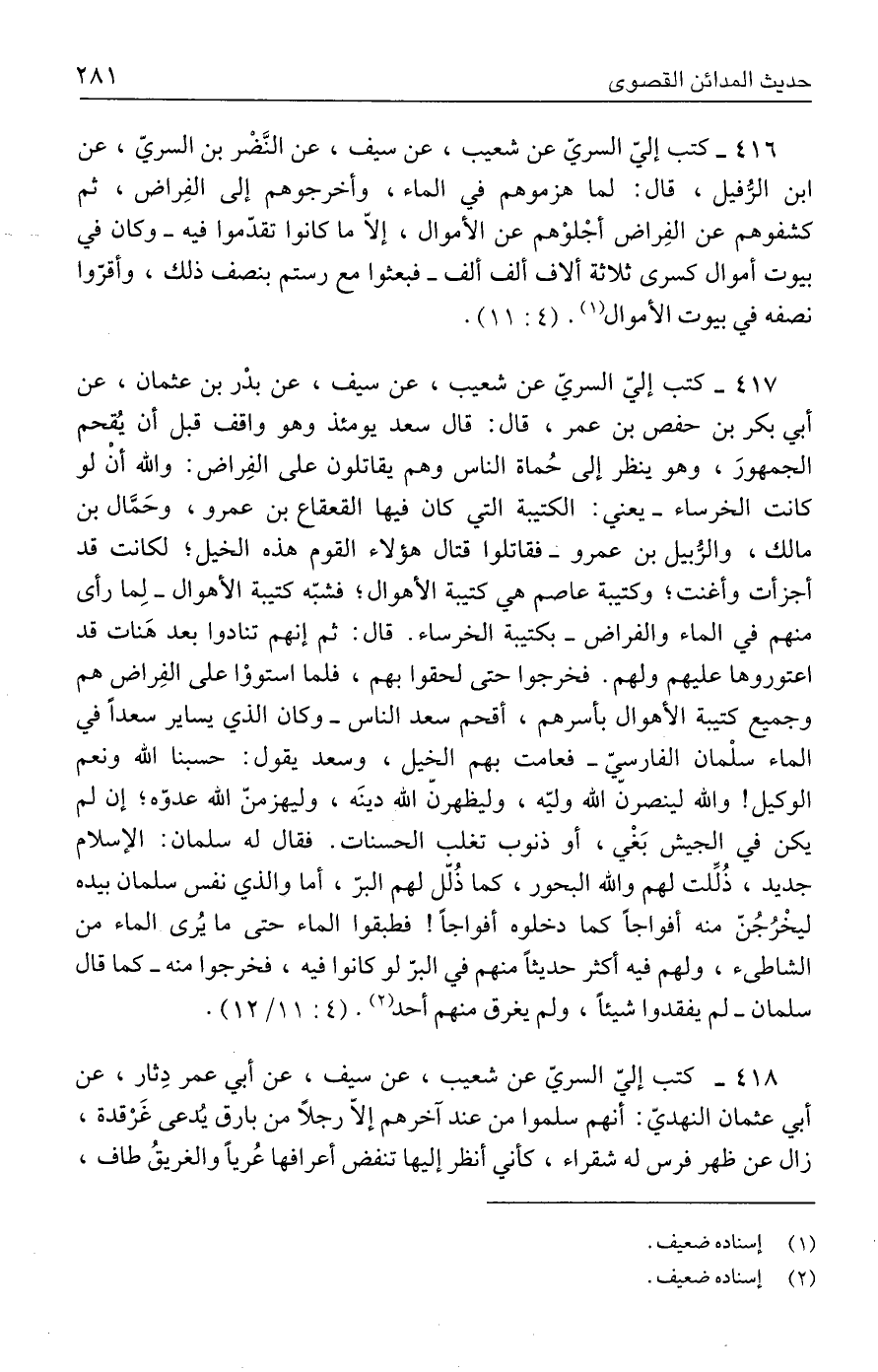 ٤١٦ - كتب إليّ السريّ عن شعيب، عن سيف، عن النَّضْر بن السريّ، عن ابن الرُّفيل، قال: لما هزموهم في الماء، وأخرجوهم إلى الفِراض، ثم كشفوهم عن الفِراض أجْلوْهم عن الأموال، إلّا ما كانوا تقدّموا فيه -وكان في بيوت أموال كسرى ثلاثة ألاف ألف ألف- فبعثوا مع رستم بنصف ذلك، وأقرّوا نصفه في بيوت الأموال (١). (٤: ١١).