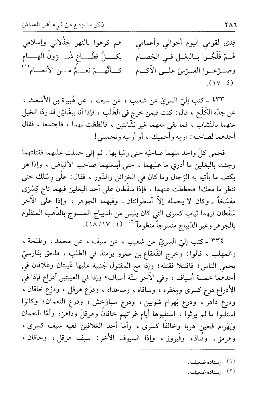 ٣٣٤ - كتب إليّ السريّ عن شعيب، عن سيف، عن محمد، وطلحة، والمهلب، قالوا: وخرج القَعقاع بن عمرو يومئذ في الطلب، فلحق بفارسيّ يحمي الناس؛ فاقتتلا فقتله؛ وإذا مع المقتول جَنيبة عليها عَيبتان وغلافان في أحدهما خمسة أسياف، وفي الآخر ستّة أسياف؛ وإذا في العيبتين أدراع فإذا في الأدراع درع كسرى ومِغفره، وساقاه، وساعداه، ودرْع هرقل، ودرْع خاقان، ودرع داهر، ودرع بَهرام شوبين، ودرع سياوَخش، ودرع النعمان؛ وكانوا استلبوا ما لم يرثوا، استلبوها أيام غزاتهم خاقانَ وهرقلَ وداهرَ؛ وأمّا النعمان وبَهْرام فحين هربا وِخالفَا كسرى، وأما أحد الغلافين ففيه سيف كسرى، وهرمز، وقُباذ، وفيروز، وإذا السيوف الأخر: سيف هرقل، وخاقان،