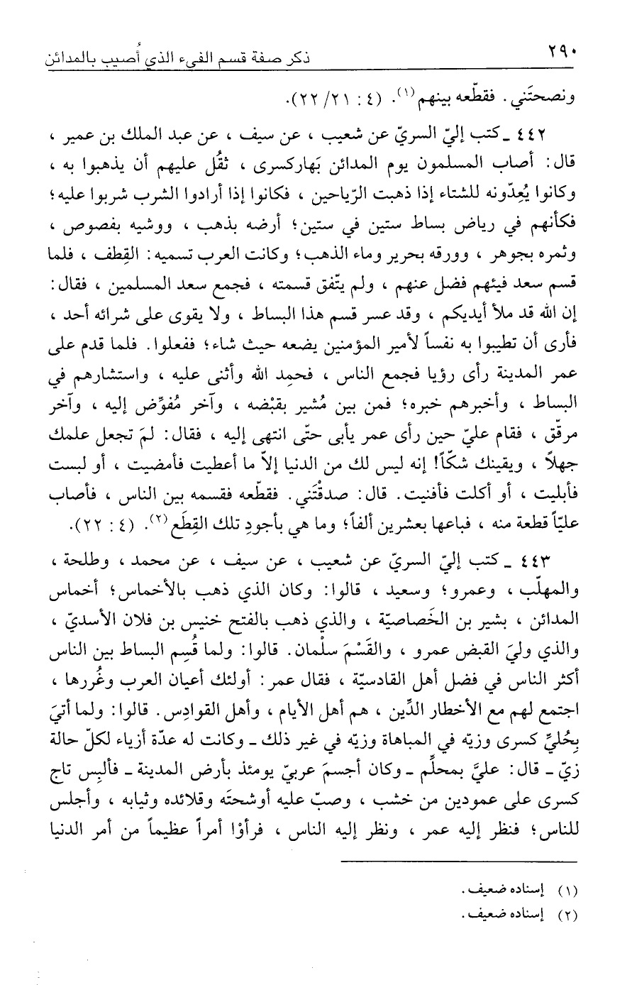 ٤٤٣ - كتب إليّ السريّ عن شعيب، عن سيف، عن محمد، وطلحة، والمهلّب، وعمرو؛ وسعيد، قالوا: وكان الذي ذهب بالأخماس؛ أخماس المدائن، بشير بن الخَصاصيّة، والذي ذهب بالفتح خنيس بن فلان الأسديّ، والذي وليَ القبض عمرو، والقَسْمَ سلْمان. قالوا: ولما قُسِم البساط بين الناس أكثر الناس في فضل أهل القادسيّة، فقال عمر: أولئك أعيان العرب وغُررها، اجتمع لهم مع الأخطار الدِّين، هم أهل الأيام، وأهل القوادِس. قالوا: ولما أتيَ بِحُليِّ كسرى وزيّه في المباهاة وزيّه في غير ذلك -وكانت له عدّة أزياء لكلّ حالة زيّ- قال: عليَّ بمحلِّم -وكان أجسمَ عربيّ يومئذ بأرض المدينة- فألبِس تاج كسرى على عمودين من خشب، وصبّ عليه أوشحتَه وقلائده وثيابه، وأجلس للناس؛ فنظر إليه عمر، ونظر إليه الناس، فرأوْا أمرًا عظيمًا من أمر الدنيا