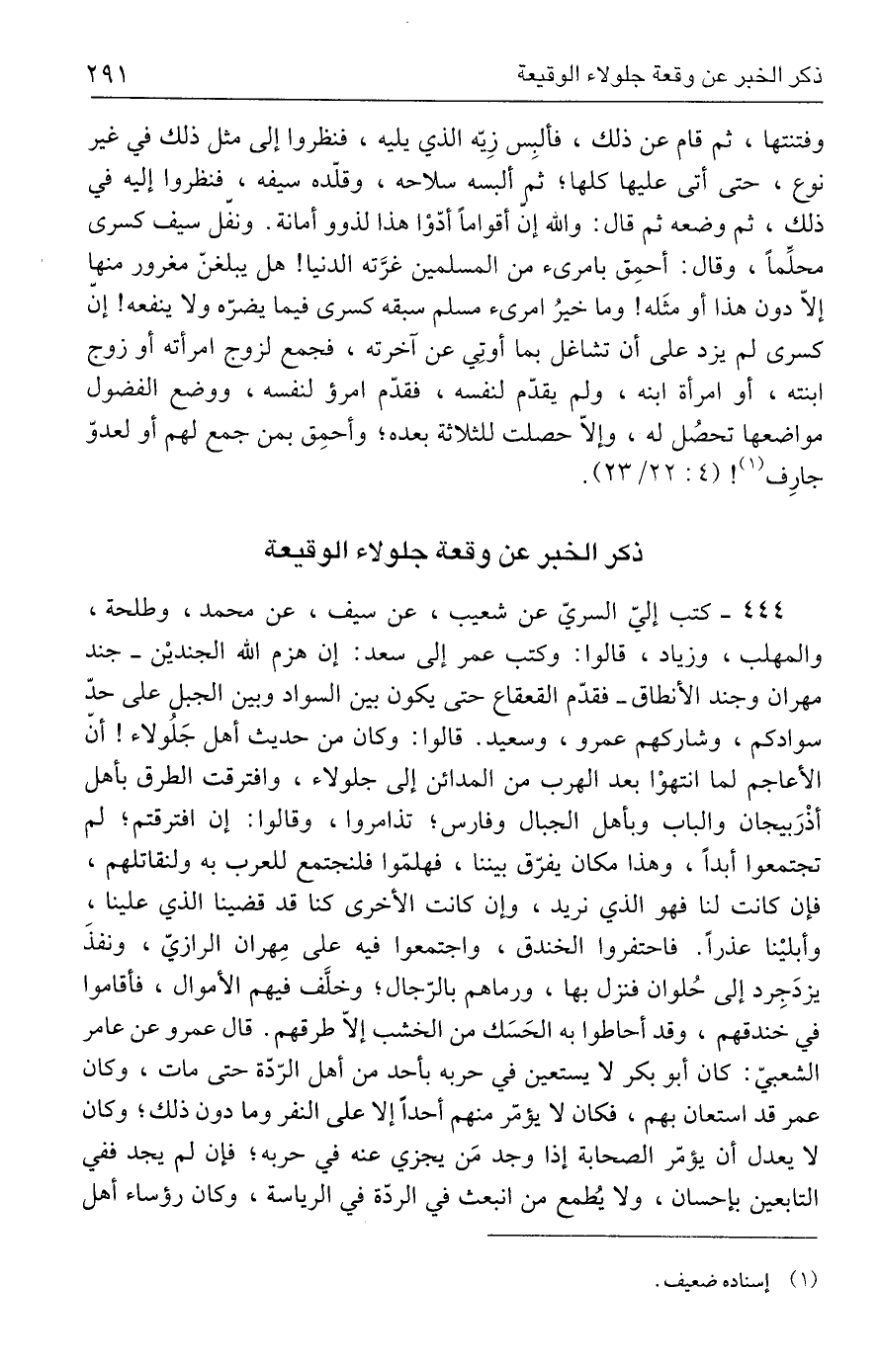 ٤٤٤ - كتب إليّ السريّ عن شعيب، عن سيف، عن محمد، وطلحة، والمهلب، وزياد، قالوا: وكتب عمر إلى سعد: إن هزم الله الجنديْن -جند مهران وجند الأنطاق- فقدّم القعقاع حتى يكون بين السواد وبين الجبل على حدّ سوادكم، وشاركهم عمرو، وسعيد. قالوا: وكان من حديث أهل جَلُولاء! أنّ الأعاجم لما انتهوْا بعد الهرب من المدائن إلى جلولاء، وافترقت الطرق بأهل أذْرَبيجان والباب وبأهل الجبال وفارس؛ تذامروا، وقالوا: إن افترقتم؛ لم تجتمعوا أبدًا، وهذا مكان يفرّق بيننا، فهلمّوا فلنجتمع للعرب به ولنقاتلهم، فإن كانت لنا فهو الذي نريد، وإن كانت الأخرى كنا قد قضينا الذي علينا، وأبليْنا عذرًا. فاحتفروا الخندق، واجتمعوا فيه على مِهران الرازيّ، ونفذَ يزدَجِرد إلى حُلوان فنزل بها، ورماهم بالرّجال؛ وخلَّف فيهم الأموال، فأقاموا في خندقهم، وقد أحاطوا به الحَسَك من الخشب إلّا طرقهم. قال عمرو عن عامر الشعبيّ: كان أبو بكر لا يستعين في حربه بأحد من أهل الرّدّة حتى مات، وكان عمر قد استعان بهم، فكان لا يؤمّر منهم أحدًا إلا على النفر وما دون ذلك؛ وكان لا يعدل أن يؤمّر الصحابة إذا وجد مَن يجزي عنه في حربه؛ فإن لم يجد ففي التابعين بإحسان، ولا يُطمع من انبعث في الردّة في الرياسة، وكان رؤساء أهل