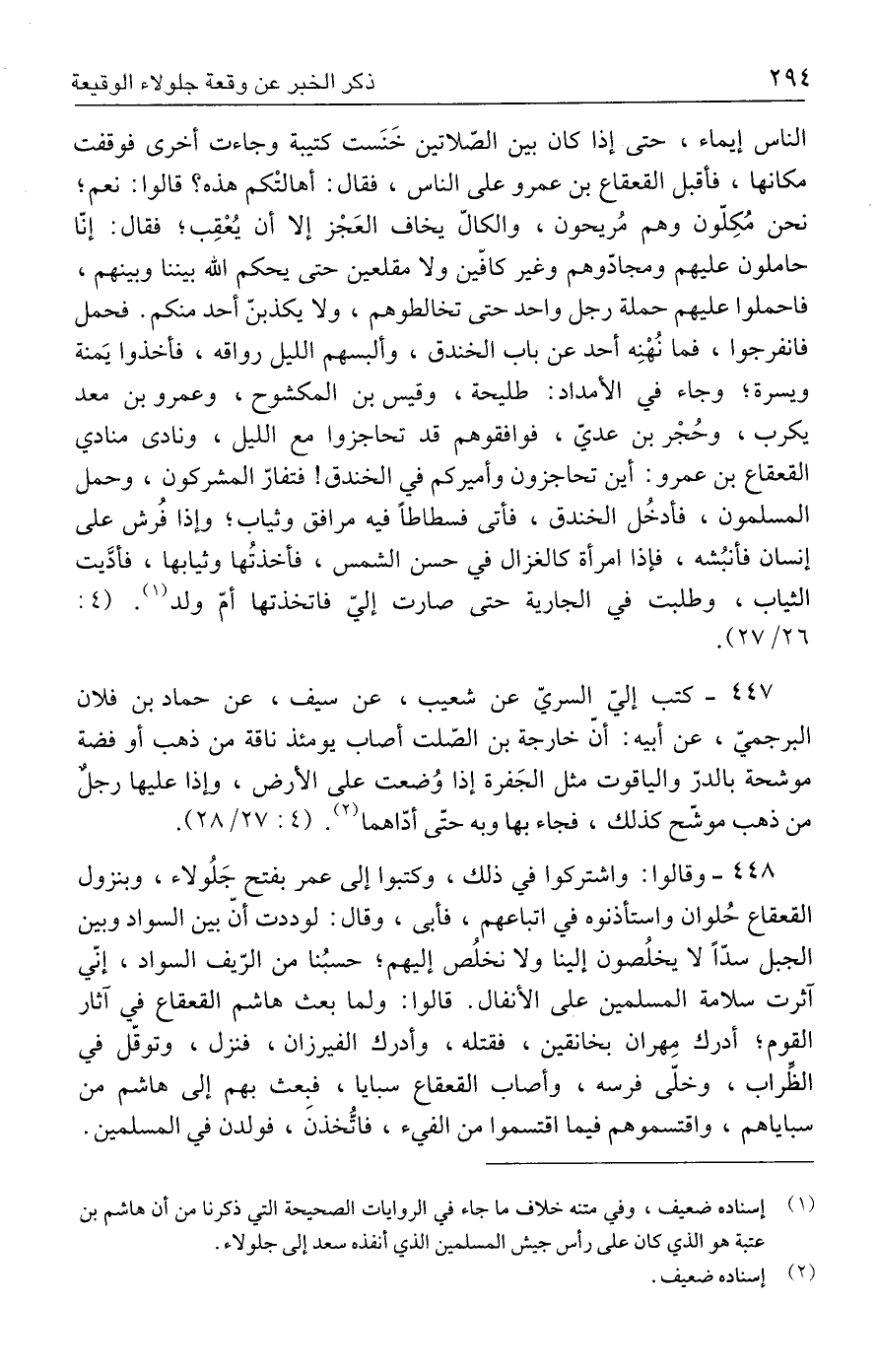(١) إسناده ضعيف، وفي متنه خلاف ما جاء في الروايات الصحيحة التي ذكرنا من أن هاشم بن عتبة هو الذي كان على رأس جيش المسلمين الذي أنفذه سعد إلى جلولاء.