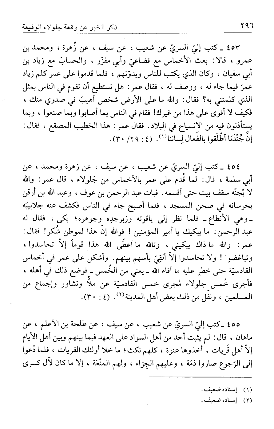٤٥٥ - كتب إليّ السريّ عن شعيب، عن سيف، عن طلحة بن الأعلم، عن ماهان، قال: لم يثبت أحد من أهل السواد على العهد فيما بينهم وبين أهل الأيام إلّا أهل قَريات، أخذوها عنوة، كلهم نكث؛ ما خلا أولئك القريات، فلما دُعوا إلى الرّجوع صاروا ذمّة، وعليهم الجِزاء، ولهم المنْعَة، إلا ما كان لآل كسرى
