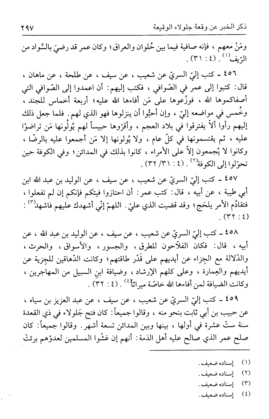 ٤٥٧ - كتب إليّ السريّ عن شعيب، عن سيف، عن الوليد بن عبد الله بن أبي طيبة، عن أبيه، قال: كتب عمر: أن احتازوا فيئكم فإنكم إن لم تفعلوا، فتقادُم الأمر يلحَج؛ وقد قضيت الذي عليّ. اللهمّ إنّي أشهدك عليهم فاشهد (٣): (٤: ٣٢).
