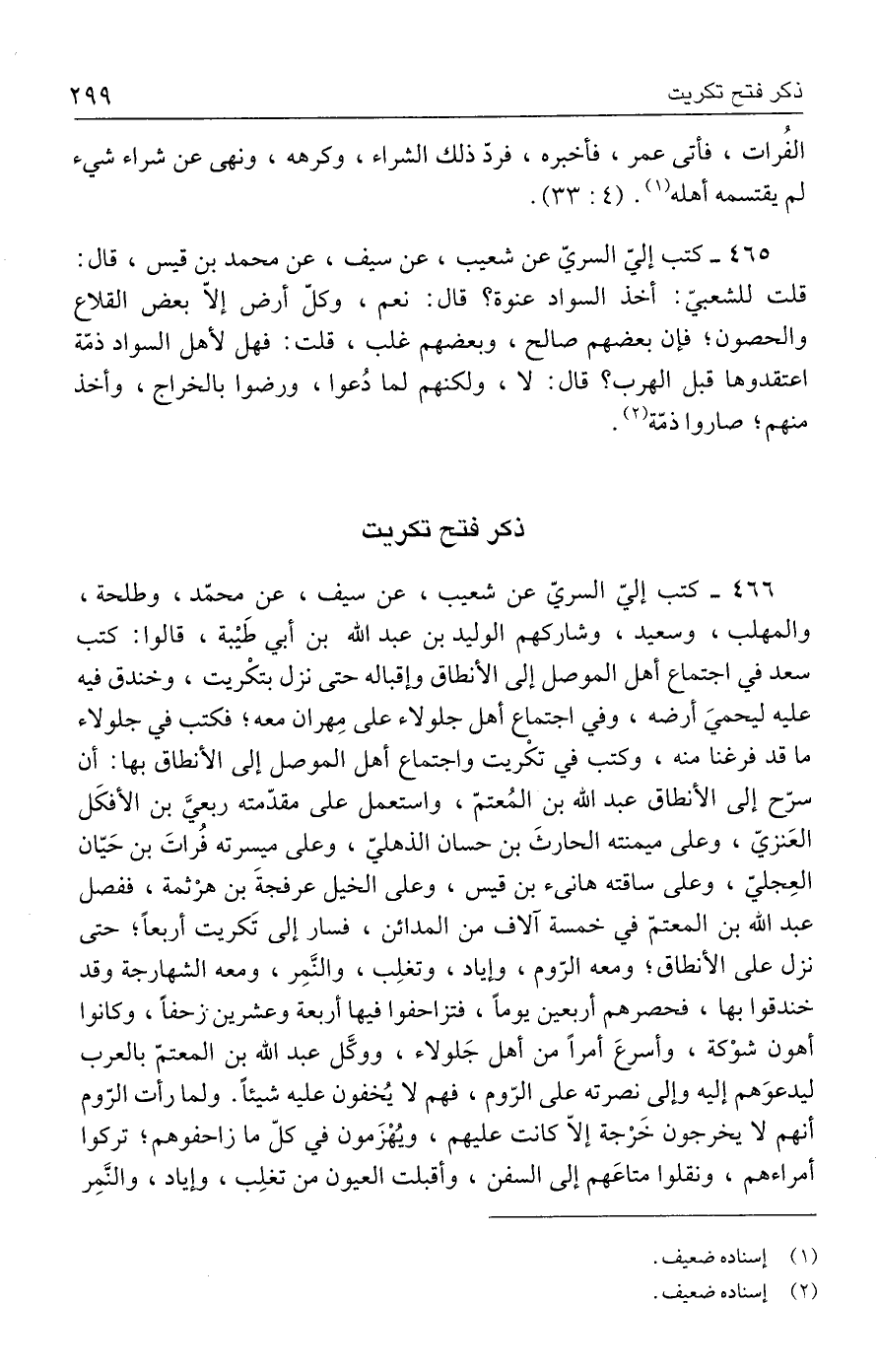 ٤٦٥ - كتب إليّ السريّ عن شعيب، عن سيف، عن محمد بن قيس، قال: قلت للشعبيّ: أخذ السواد عنوة؛ قال: نعم، وكلّ أرض إلّا بعض القلاع والحصون؛ فإن بعضهم صالح، وبعضهم غلب، قلت: فهل لأهل السواد ذمّة اعتقدوها قبل الهرب؟ قال: لا، ولكنهم لما دُعوا، ورضوا بالخراج، وأخذ منهم؛ صاروا ذمّة (٢).