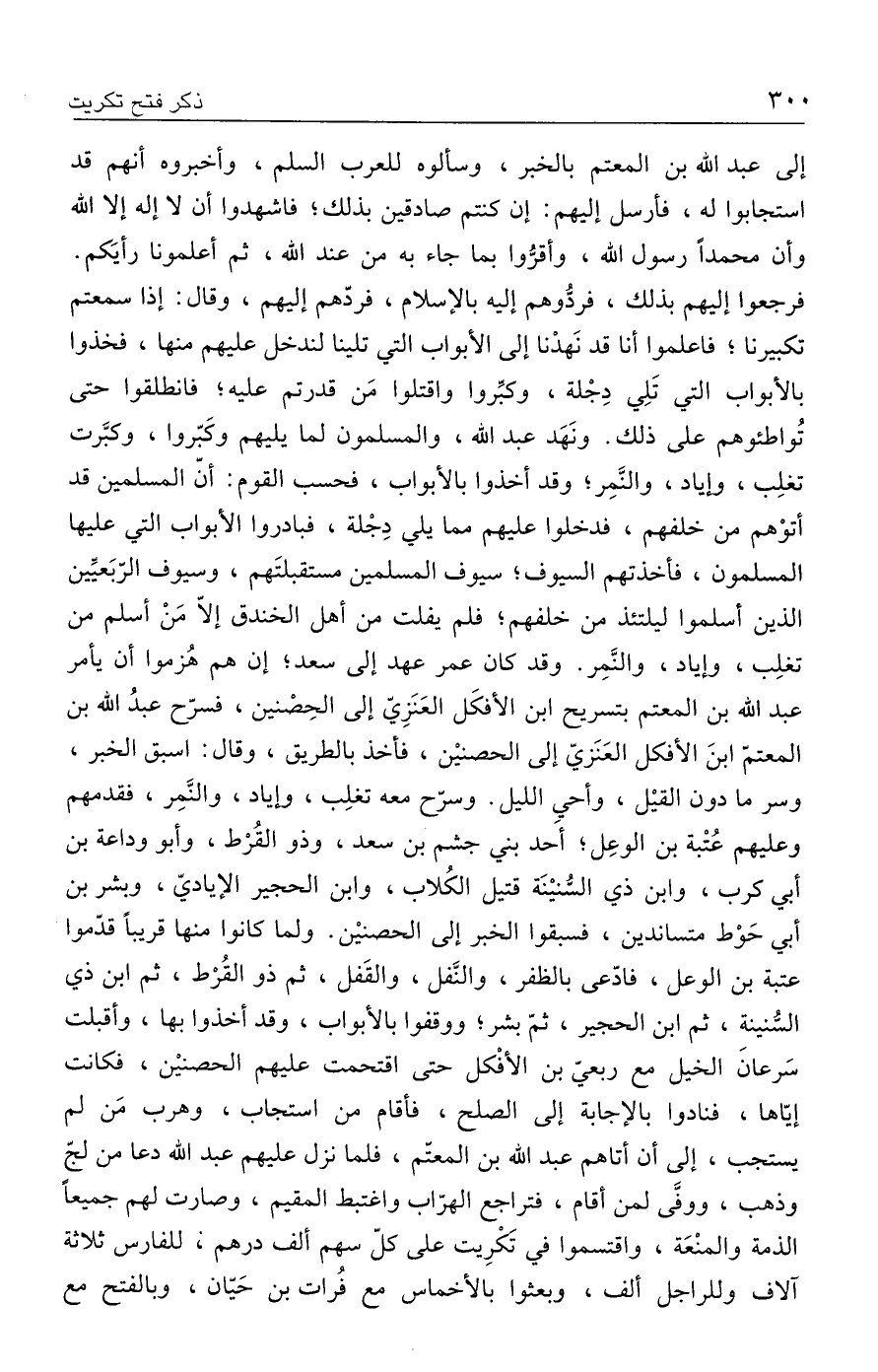 إلى عبد الله بن المعتم بالخبر، وسألوه للعرب السلم، وأخبروه أنهم قد استجابوا له، فأرسل إليهم: إن كنتم صادقين بذلك؛ فاشهدوا أن لا إله إلا الله وأن محمدًا رسول الله، وأقرُّوا بما جاء به من عند الله، ثم أعلمونا رأيَكم. فرجعوا إليهم بذلك، فردُّوهم إليه بالإسلام، فردّهم إليهم، وقال: إذا سمعتم تكبيرنا؛ فاعلموا أنا قد نَهدْنا إلى الأبواب التي تلينا لندخل عليهم منها، فخذوا بالأبواب التي تَلِي دِجْلة، وكبِّروا واقتلوا مَن قدرتم عليه؛ فانطلقوا حتى تُواطئوهم على ذلك. ونَهَد عبد الله، والمسلمون لما يليهم وكَبّروا، وكبَّرت تغلِب، وإياد، والنَّمِر؛ وقد أخذوا بالأبواب، فحسب القوم: أنّ المسلمين قد أتوْهم من خلفهم، فدخلوا عليهم مما يلي دِجْلة، فبادروا الأبواب التي عليها المسلمون، فأخذتهم السيوف؛ سيوف المسلمين مستقبلتَهم، وسيوف الرّبَعيِّين الذين أسلموا ليلتئذ من خلفهم؛ فلم يفلت من أهل الخندق إلّا مَنْ أسلم من تغلِب، وإياد، والنَّمِر. وقد كان عمر عهد إلى سعد؛ إن هم هُزموا أن يأمر عبد الله بن المعتم بتسريح ابن الأفكَل العَنَزِيّ إلى الحِصْنين، فسرّح عبدُ الله بن المعتمّ ابنَ الأفكل العَنَزيّ إلى الحصنيْن، فأخذ بالطريق، وقال: اسبق الخبر، وسر ما دون القيْل، وأحي الليل. وسرّح معه تغلِب، وإياد، والنَّمِر، فقدمهم وعليهم عُتْبة بن الوعِل؛ أحَد بني جشم بن سعد، وذو القُرْط، وأبو وداعة بن أبي كرب، وابن ذي السُّنيْنَة قتيل الكُلاب، وابن الحجير الإياديّ، وبشر بن أبي حَوْط متساندين، فسبقوا الخبر إلى الحصنيْن. ولما كانوا منها قريبًا قدّموا عتبة بن الوعل، فادّعى بالظفر، والنَّفل، والقَفل، ثم ذو القُرْط، ثم ابن ذي السُّنينة، ثم ابن الحجير، ثمّ بشر؛ ووقفوا بالأبواب، وقد أخذوا بها، وأقبلت سَرعانَ الخيل مع ربعيّ بن الأفْكل حتى اقتحمت عليهم الحصنيْن، فكانت إيّاها، فنادوا بالإجابة إلى الصلح، فأقام من استجاب، وهرب مَن لم يستجب، إلى أن أتاهم عبد الله بن المعتم، فلما نزل عليهم عبد الله دعا من لجّ وذهب، ووفَّى لمن أقام، فتراجع الهرّاب واغتبط المقيم، وصارت لهم جميعًا الذمة والمنْعَة، واقتسموا في تَكْرِيت على كلّ سهم ألف درهم، للفارس ثلاثة آلاف وللراجل ألف، وبعثوا بالأخماس مع فُرات بن حَيّان، وبالفتح مع